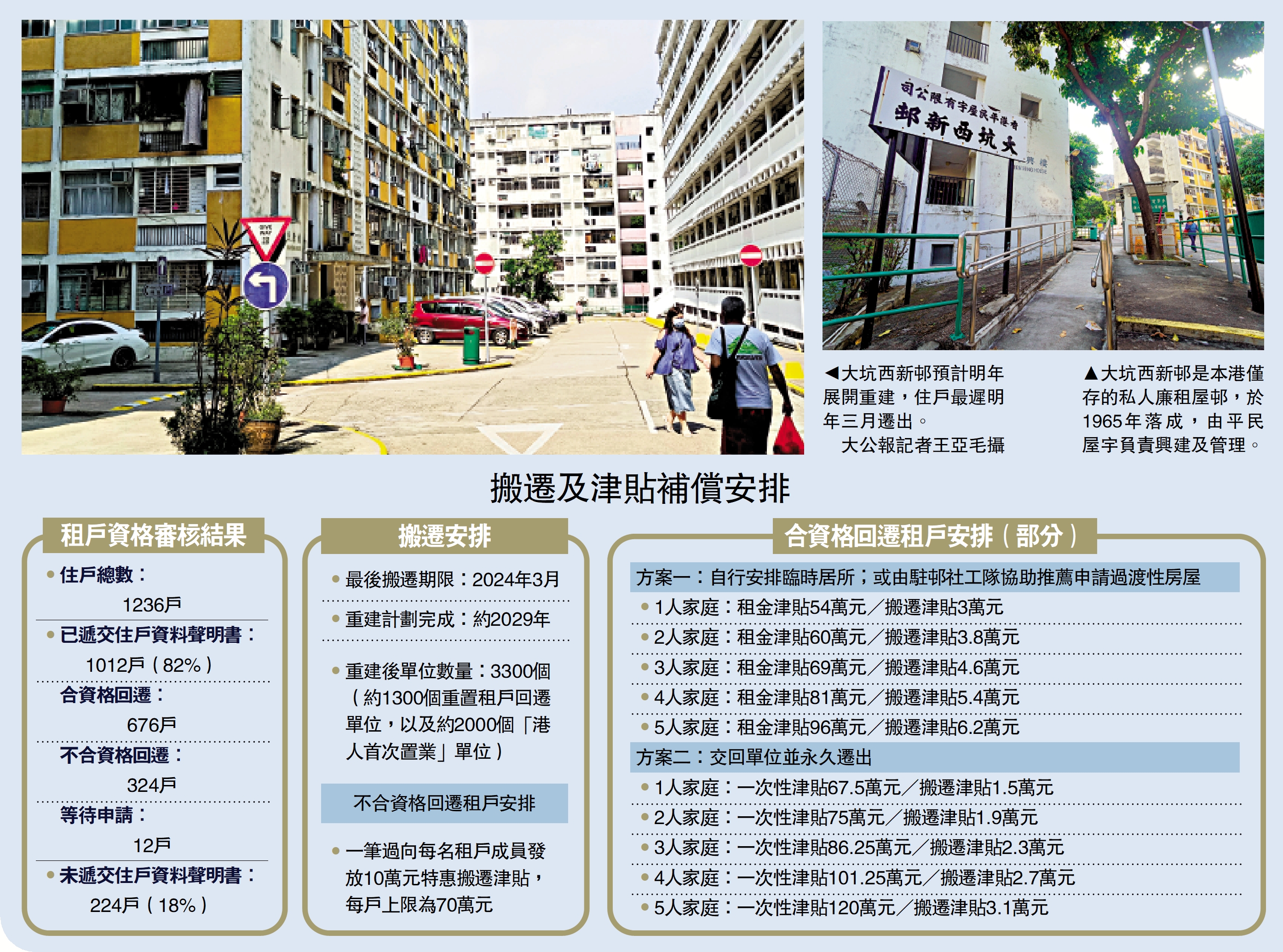 行政會議前年批准市建局及香港平民屋宇有限公司合作重建大坑西新邨,重建後提供逾3300個單位。平民屋宇於去年起進行住戶回遷及特惠津貼資格的審核工作,最終收回1012份住戶資料聲明書,當中676戶符合回遷資格、12戶有待審核,但有324戶則完全不符合資格,主要原因包括戶主或個別家庭成員擁有物業、正享用政府資助出租或出售房屋、並非租約登記住戶成員,或並非實質居住在該單位等。相關結果信封昨日已通過駐邨社工發放。