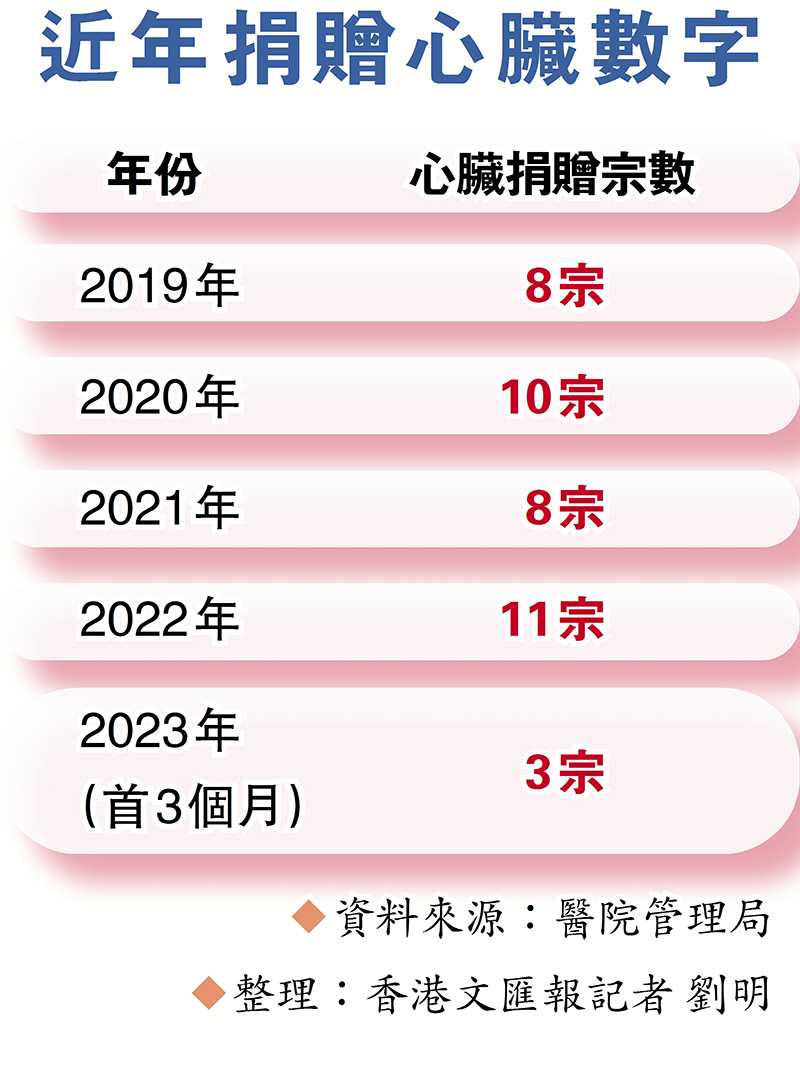 由2019年至去年的4年間,香港每年捐贈心臟數字只有8宗至11宗不等,今年首三個月只得3宗,但輪候心臟移植的病人有80人。香港在過去30年進行的心臟移植手術超過250宗,即每年也不足10宗移植個案。