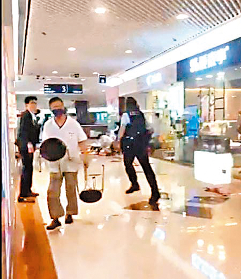在前日案發後,有市民拍攝到商場內的混亂場面。當不少人受驚逃離案發現場時,有人發現倒臥在血泊中的兩名女傷者,至少有5名男女市民或商場職員打扮者衝向傷者施救,而兇徒就站在10米開外。畫面中,一名白衣男子兩手各持一張圓凳站在兇徒對面,也有市民拍到他站在長髮女傷者身旁,持凳與兇徒對峙的情景。當警員到場後,他即持凳靜靜離開現場。