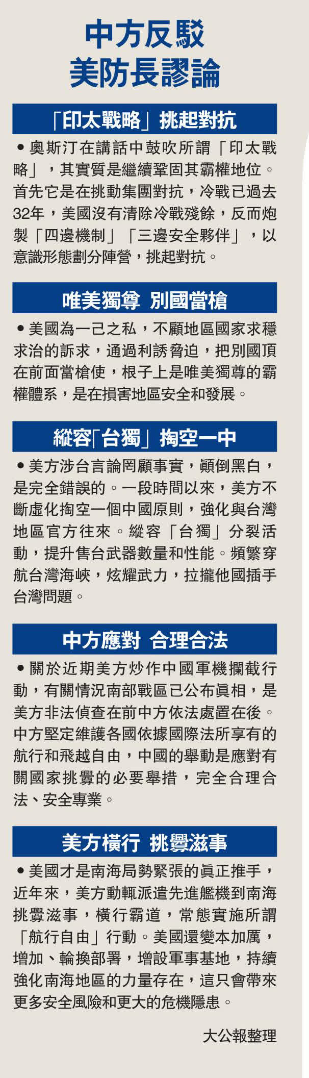 大公報綜合新華社、中新社報道:中國代表團3日在香格里拉對話會期間舉行媒體吹風會,堅決反對美國防長奧斯汀大會發言對中方的不實指責,就美「印太戰略」、台灣問題、南海問題、中美兩軍關係介紹中方原則立場,並送美方三句話:「領導不是霸權,地位取決作為,行動勝於空談。」對於南海問題,中央軍委聯合參謀部副參謀長景建峰中將表示,美國為了一己私利挑起對抗,美國才是南海局勢緊張的真正推手。地區國家有能力、有信心、有智慧處理好南海問題,不需要域外國家來多管閒事。