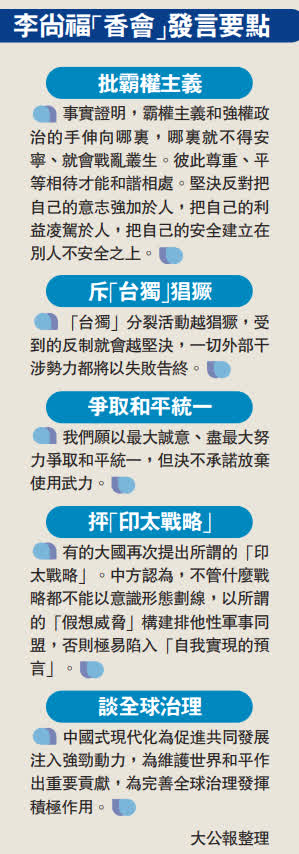 李尚福在發言中表示,中華民族五千多年來始終崇尚「以和為貴」,新中國成立70多年來,從未主動挑起一次衝突,從未侵佔別國一寸土地,從未發動過一場代理人戰爭,是全世界和平紀錄最好的大國。中國堅持走和平發展道路,但決不會放棄維護自身正當權益,更不會犧牲國家核心利益。