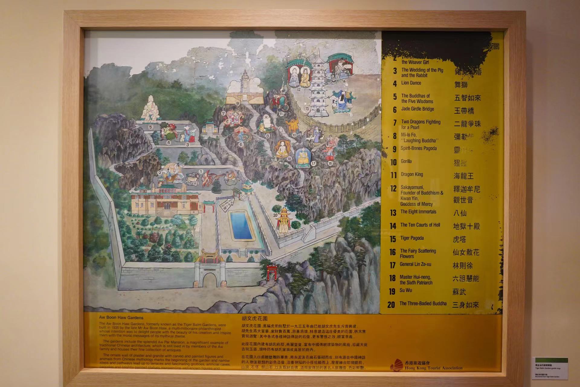 毗連虎豹別墅的萬金油花園,其建築、塑像和建造工藝均融入民間傳說、佛教和道教思想,以傳揚和教導傳統價值觀為本。曾經的香港沒有公園或公共遊樂設施予華人享用,胡文虎就免費開放花園供市民遊覽,希望宣傳產品的同時,利用公園內描述中國傳統神話的雕塑及壁畫,向參觀者宣揚中華文化。後來萬金油花園需拆卸並改建為住宅樓宇,部分塑像則遷移至虎豹別墅的戶外空間進行展示。