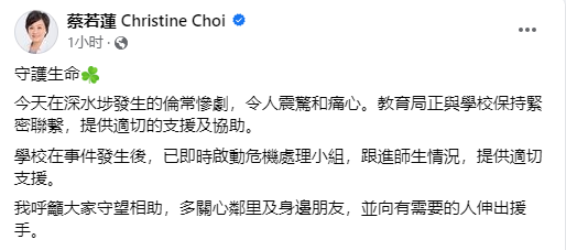 蔡若蓮發文指,今天在深水埗發生的倫常慘劇,令人震驚和痛心。教育局正與學校保持緊密聯繫,提供適切的支援及協助。她又呼籲大家守望相助,多關心鄰里及身邊朋友,並向有需要的人伸出援手。