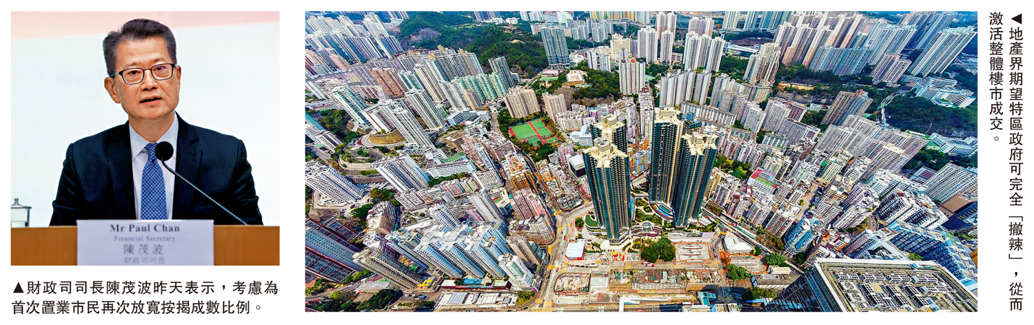 對於財政司司長陳茂波考慮為首置人士再放寬按揭,地產界普遍相信有助刺激中細價樓市場,但仍然期望特區政府可完全撤辣,從而激活整體樓市成交。