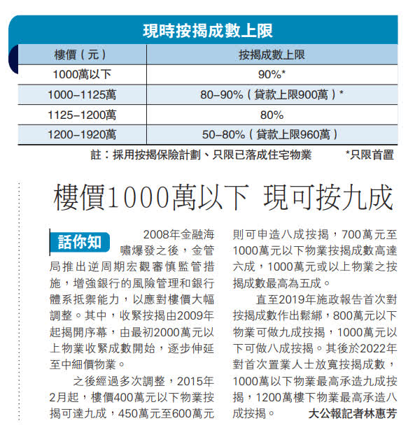 香港城市大學建築科技學部高級講師潘永祥認為,放寬按揭成數應該「向下看」,集中在500萬或以下的中低樓價單位,甚至可申請最高九成半的按揭貸款,但要附加壓力測試的條件,以評估申請者的風險。