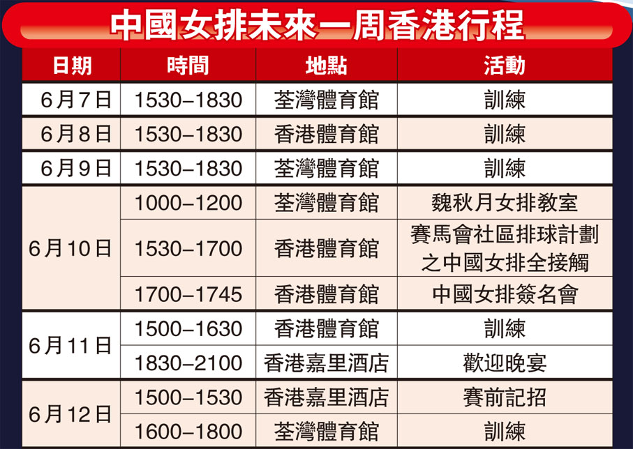 「中國人壽(海外)FIVB世界女排聯賽香港2023」將於本月13日至18日在香港體育館(紅館)舉行。中國女排來港陣容中,除手腕受傷的朱婷休戰未隨隊外,出戰名古屋站的主力球員全部抵港。根據大會公布行程,中國女排在下周比賽之前,會出席多項活動。快來一圖睇清!