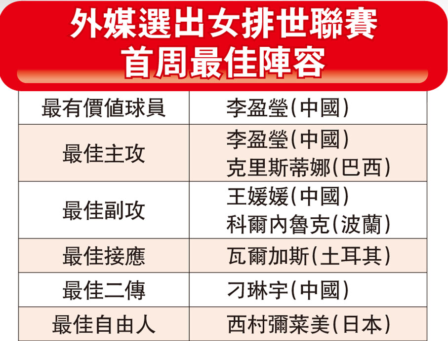 外媒總結所有賽事之後,選出了第一周最佳陣容及MVP,中國女排有主攻手李盈瑩、副攻王媛媛以及二傳刁琳宇入選,其中李盈瑩還榮膺首周MVP,成為本次評選的最大贏家。最佳陣容其他4人分別是土耳其女排接應瓦爾加斯、巴西女排主攻克里斯蒂娜、波蘭女排副攻科爾內魯克以及日本女排自由人西村彌菜美,較意外的是同樣4連勝的美國卻無人入選。