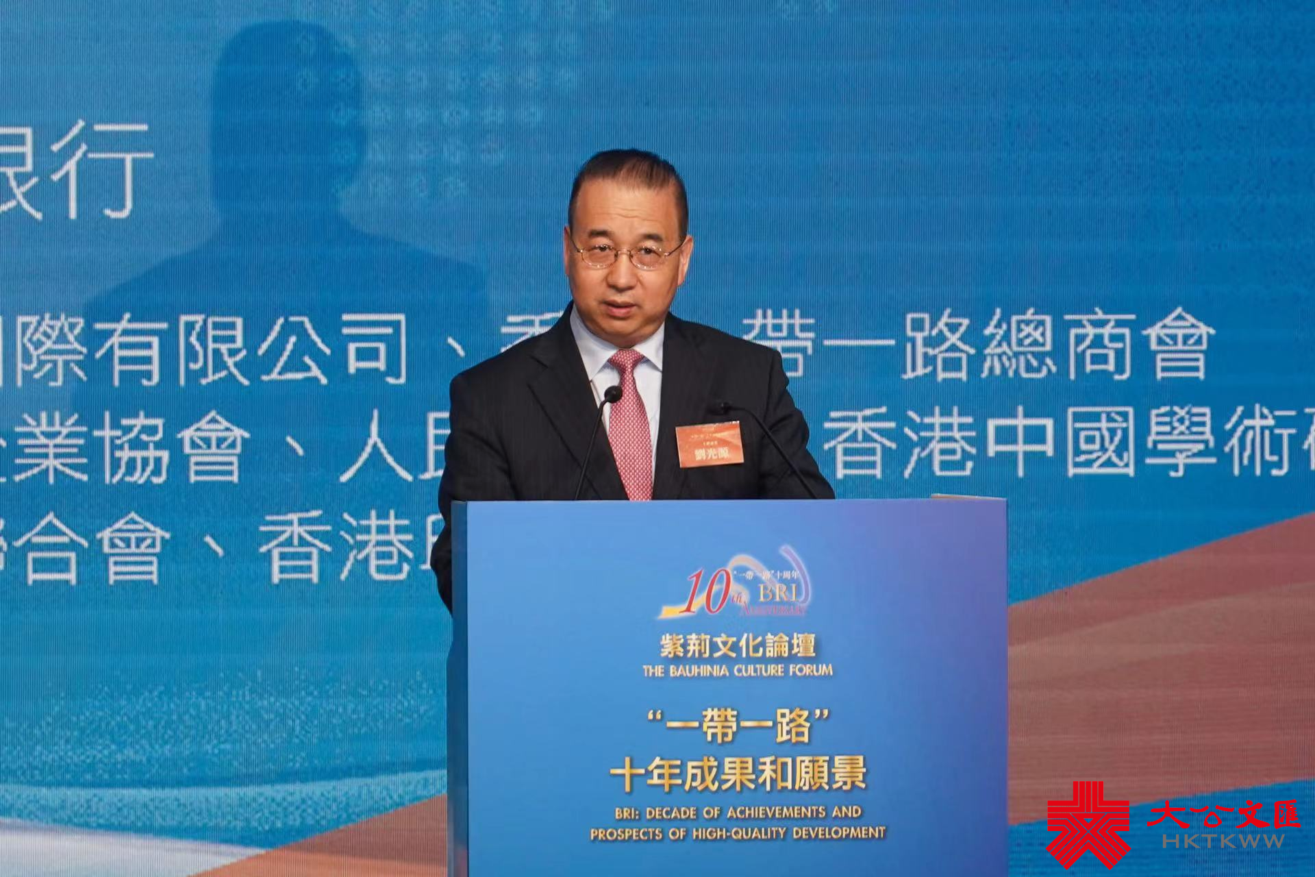 劉光源致辭時表示,隨着「六廊六路多國多港」架構基本成形,一大批務實合作項目扎實推進,共建「一帶一路」持續彰顯韌性與活力,為世界經濟發展引入源源「活水」。2013至2022年,中國與沿線國家貨物貿易額年均增長8%,雙向投資累計突破2700億美元。當今全球性挑戰層出不窮。與此同時,外交公署始終踐行外交惠港,擴大對外交往合作,全方位參與「一帶一路」建設。