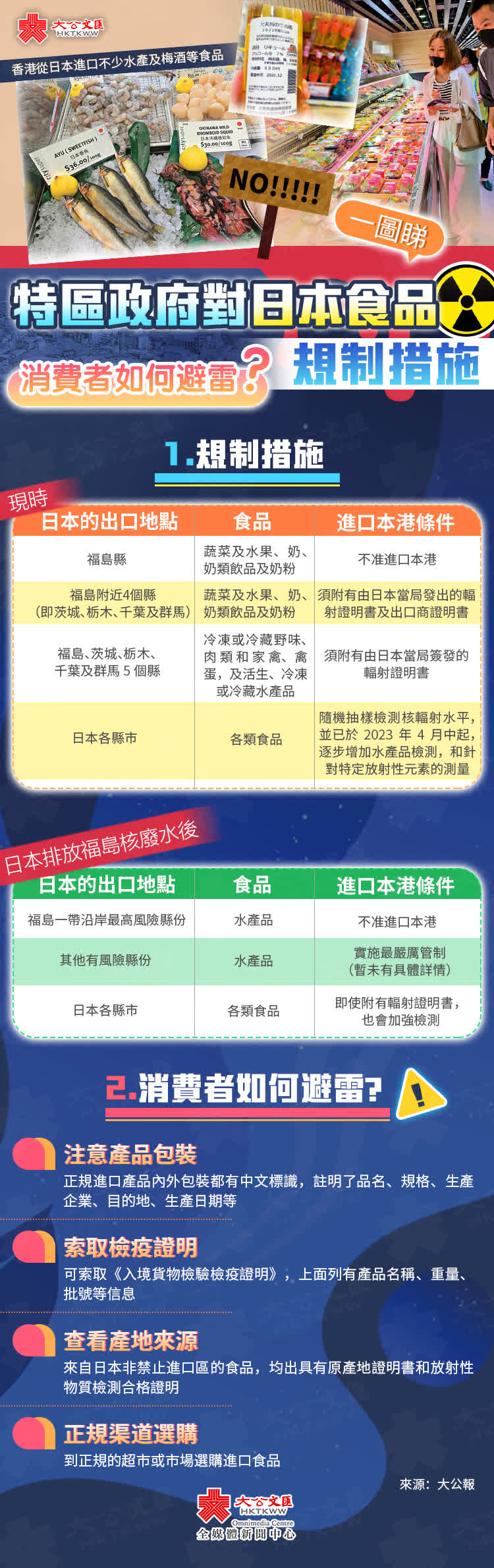 (大公報記者 賴振雄 王亞毛)日本政府開始向福島第一核電站核污染水排海隧道注入海水,準備為排放核廢水做準備。環境及生態局局長謝展寰今日在《大公報》撰文(全文刊A4),他表示,食品安全是民生大事,為保障市民健康,特區政府已經成立跨部門專責小組,只要日本排放福島核廢水,會即時採取措施,包括禁止福島一帶沿岸高風險縣份的水產品進口香港,及對其他有風險縣份的水產品實施嚴厲進口管制。他又提醒食品進口商和餐飲業界,要預早作出安排。