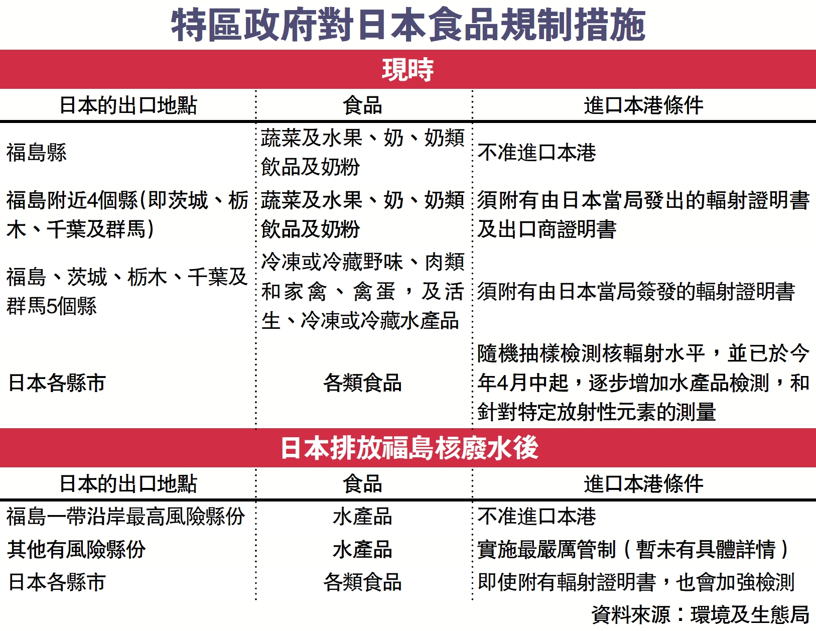 謝展寰強調,一旦日本開始排放廢水,特區政府即時採取措施,包括禁止福島一帶沿岸最高風險縣份的水產品的進口,以及對其他有風險縣份水產品的進口實施嚴厲管制。
