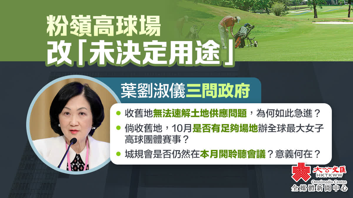 葉劉淑儀在社交媒體撰寫《粉嶺高爾夫球會「舊場」地段修訂為「未決定用途」衍生的問題》的文章指,發展局確認政府於去年10月批出一份顧問合約,聘請顧問公司展開關於收回舊場的土地調查、設計及建築研究,費用超過3000萬元、研究期長達10年。研究已於去年10月開始,換言之最快要在2031年才完成報告,即使政府今年9月收回相關地段,也未能馬上動工興建房屋。