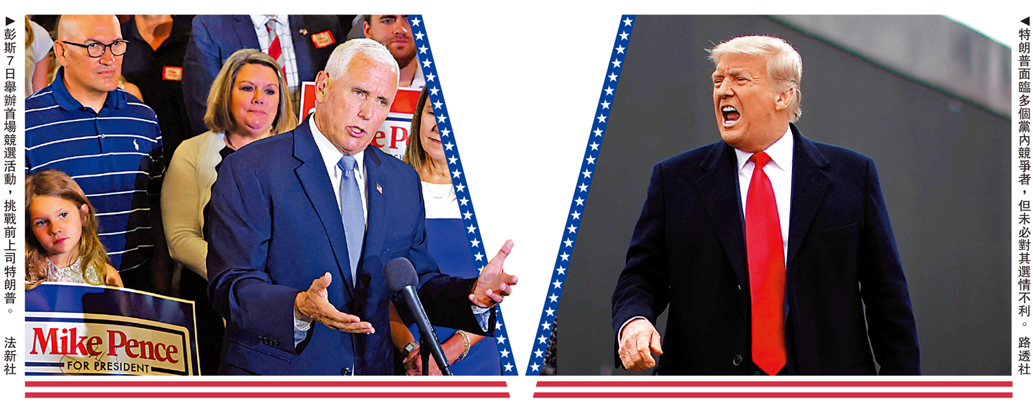 大公報綜合CNN、《紐約時報》、美國之音報道:當地時間7日,美國前副總統彭斯舉行首場2024年總統選舉競選活動,劍指前總統特朗普,成為有史以來首位直接挑戰昔日競選夥伴的美國前副總統。彭斯稱,特朗普試圖將自己凌駕於憲法之上,他永遠不應重返白宮。新澤西州前州長克里斯蒂、北達科他州現任州長布爾古姆亦加入選戰,共和黨陣營候選人已多達11位。但有分析認為,這些人會分流「反特」群體的選票,反而有助於特朗普再次獲得黨內提名。