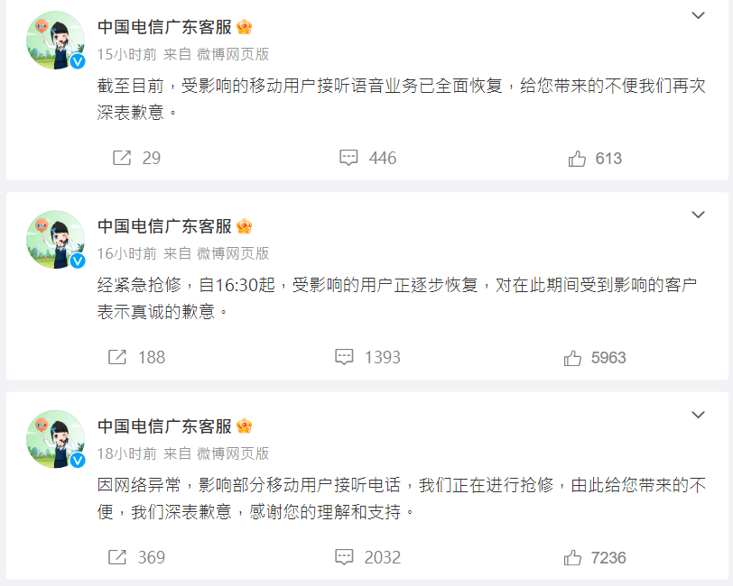 對此,中國電信官方客服回應,「因廣東電信系統故障維護導致影響了部分用戶的語音、短訊和信號等業務,正在加急處理」。中國電信廣東客服在其官方微博發布聲明稱,「經緊急搶修,自16:30起,受影響的用戶正逐步恢復,對在此期間受到影響的客戶表示真誠的歉意。」
