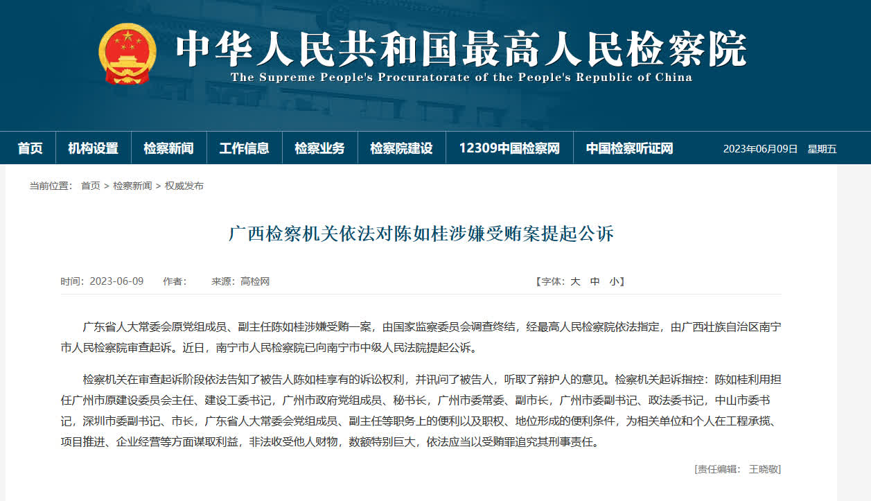 據最高人民檢察院官方網站消息,廣東省人大常委會原黨組成員、副主任陳如桂涉嫌受賄一案,由國家監察委員會調查終結,經最高人民檢察院依法指定,由廣西壯族自治區南寧市人民檢察院審查起訴。近日,南寧市人民檢察院已向南寧市中級人民法院提起公訴。