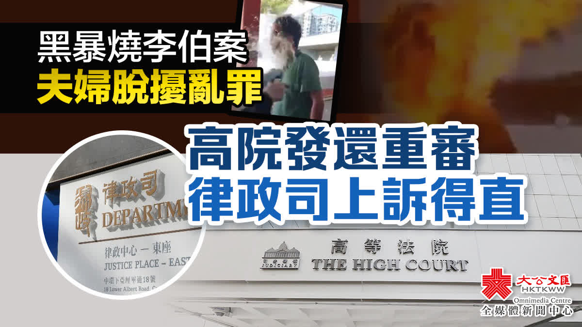 大公文匯全媒體報道,地盤工李伯2019年11月11日在馬鞍山見義勇為,阻止及追截破壞港鐵設施的黑暴分子時,慘遭黑衣魔扑頭襲擊及淋易燃液點火焚身,嚴重燒傷一度命危。案中一對夫婦當日在現場以粗言叫囂,被控一項在公眾地方內擾亂秩序行為罪,惟經審訊後被裁定無罪。律政司不服裁決,以案件呈述方式向高院提出上訴。高院原訟庭經上月中開庭後,法官張慧玲今日(9日)裁定案件須發還原審裁判官,依據張官所指示的法律觀點,重新考慮2名答辯人是否有罪。