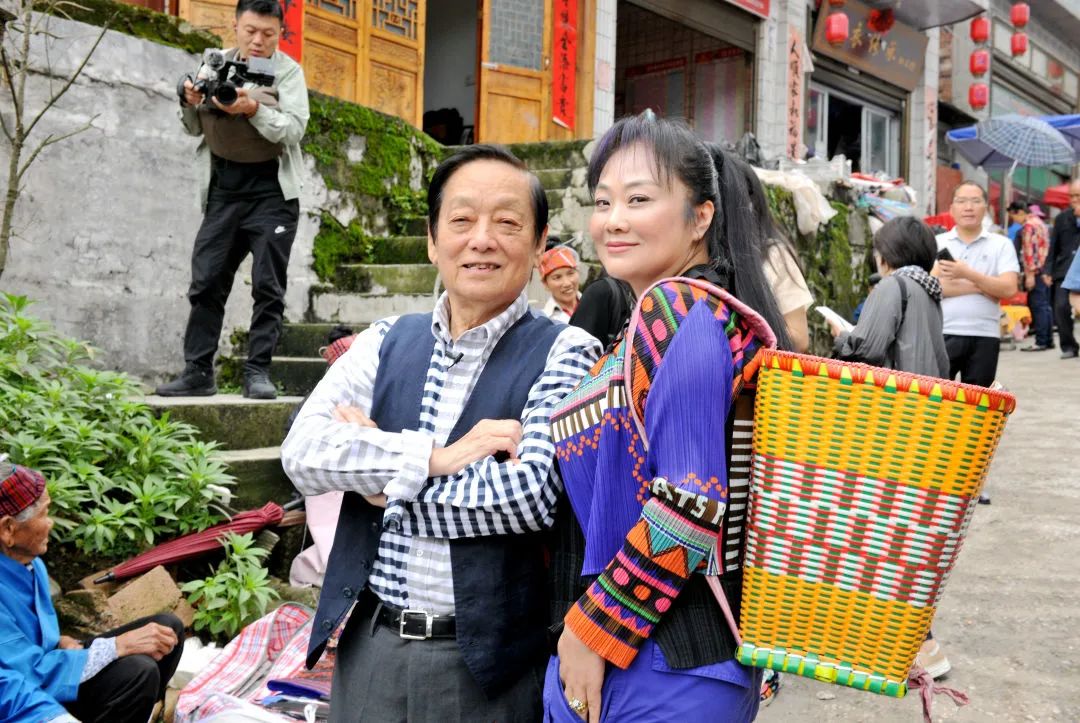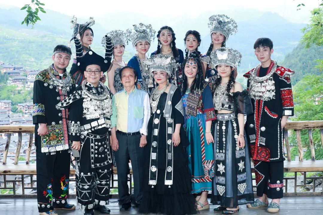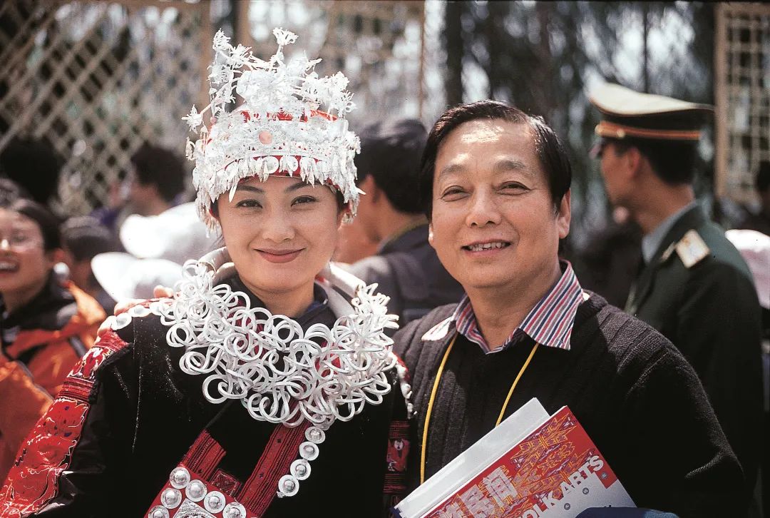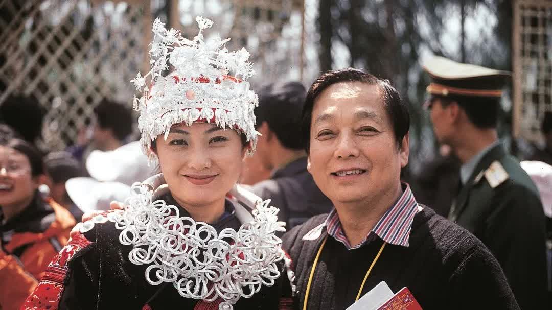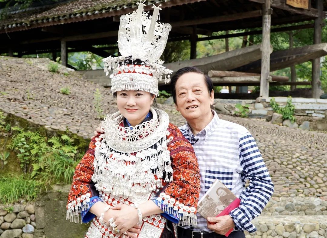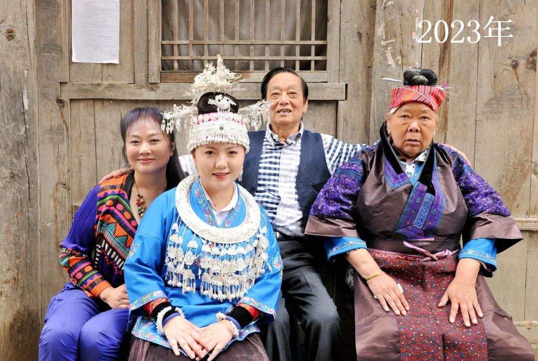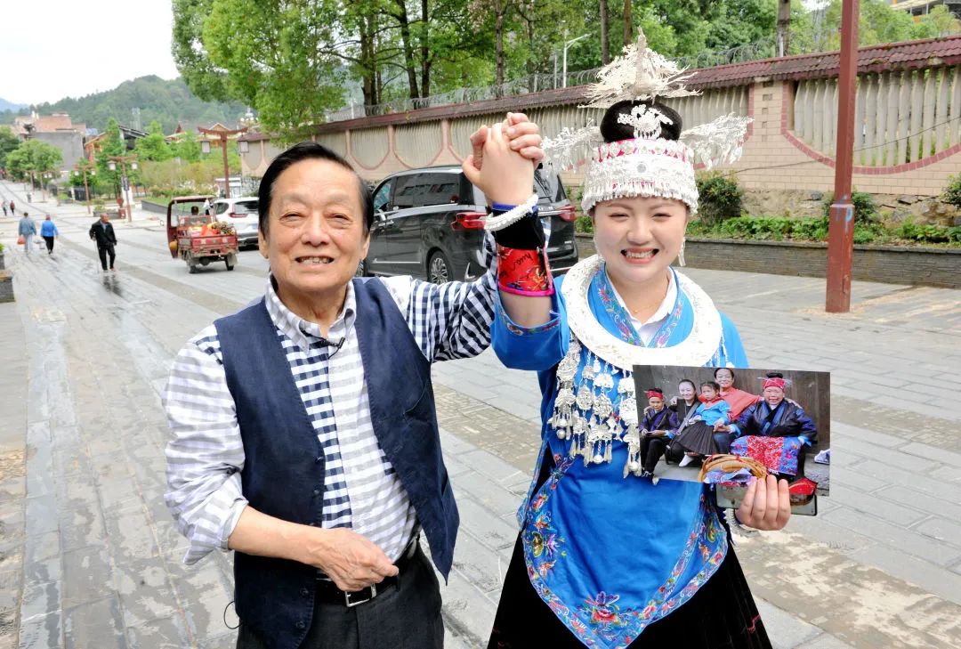 走出刺繡集市,路過窄巷去乘車的韓美林,在一處老寨子前,面對一位苗族老奶奶站住了腳步。「老奶奶,你對我還有印象嗎?20年前我就在這兒跟你拍過照,問你買過綉品,討教過紋樣。」旁邊一位苗族盛裝少女拿出一張20年前的老照片,用苗語邊指邊跟老奶奶說:「阿奶,能認出來這是五歲的我,這是你吧。旁邊的就是韓老師和周老師,她們專程來看你了。」