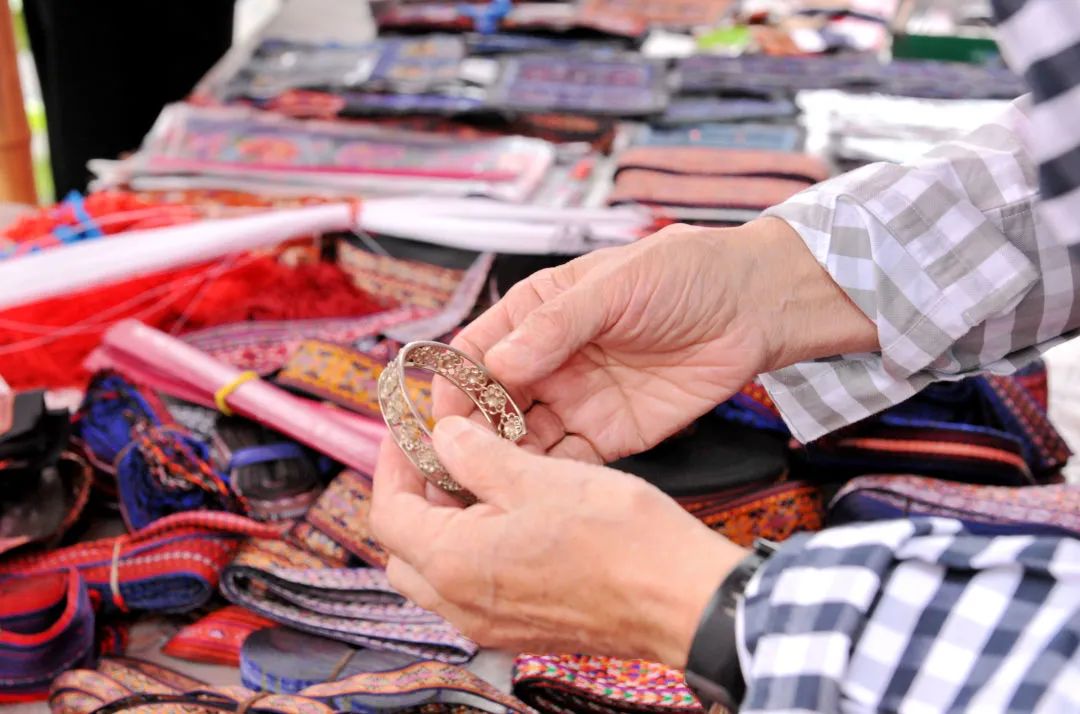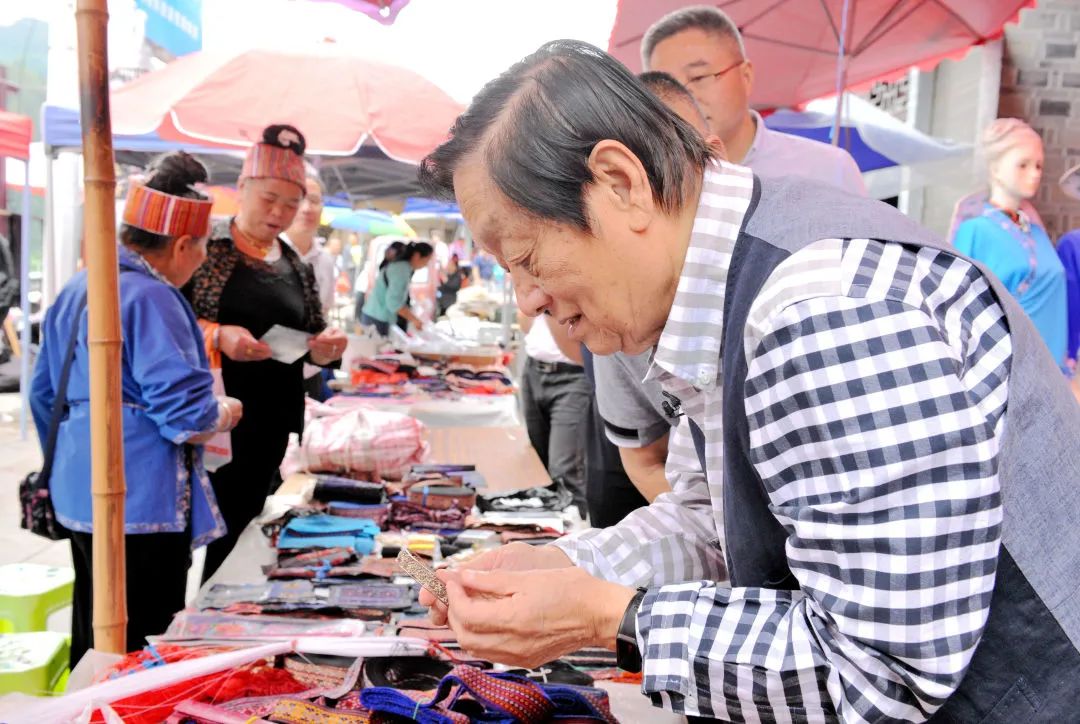 韓美林一個攤位一個攤位仔細地看,85歲的綉娘奶奶還熱心提醒韓美林,「那個是機繡的,這個才是手繡的。」雖然藝術大篷車一行是從外地來,但每一個當地攤主都耐心介紹着手中綉品和苗銀首飾上各類紋樣的吉祥含義,蝴蝶、小貓、龍、鳳、花、鳥……韓美林邊走邊看邊感慨:「誰說普通的生活不能藝術,看看這最高級的藝術生活。我們跋山涉水、上下求索的藝術靈感,就刻在他們的基因裏,所以我們必須得來向他們學習,向民間學習。」