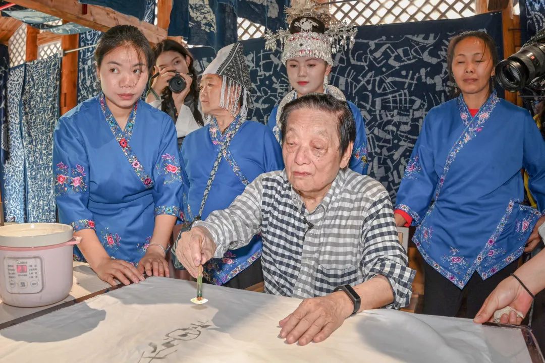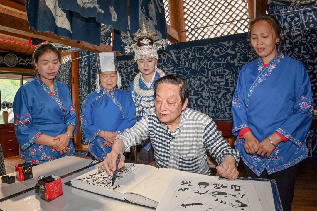 他與蠟染和刺繡手工藝人暢談這20年,貴州民間藝術的發展。說到最初接觸蠟染,韓美林回憶到:「藍色是全世界公認從古至今都最珍貴稀有的顏色,貴州蠟染堅持用植物染料,用純手工打造,這才是真正的『奢侈品』,是中國式的藝術高級定製。但工藝傳承只是第一步,沒有任何一種藝術形式是不需要表現時代變遷和地域特點的。所以無論是蠟染還是刺繡,在形式上必須突破傳統,與時代相連。我最近就想着把我『天書』裏收集整理的古文字用更多民間藝術的形式表達出來。」