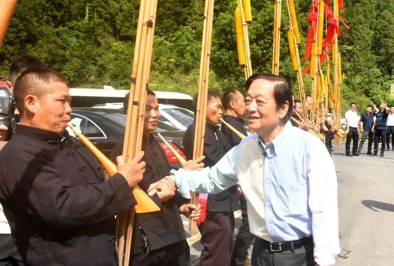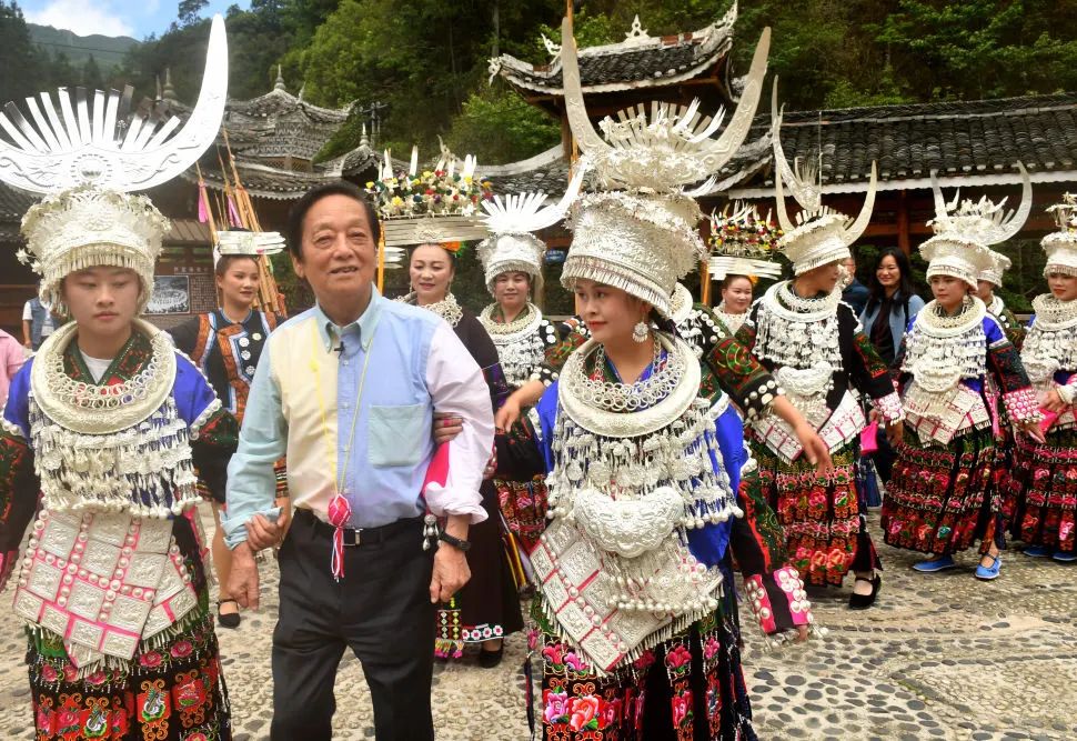 韓美林在接受貴陽記者採訪的時候就剛從盛裝踩鼓舞的隊伍裏出來,坐在青山和綠水旁。