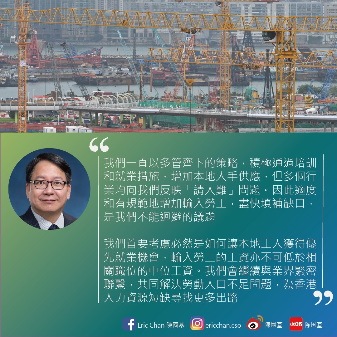 陳國基表示,明白勞工界的關注,當局承諾會首要考慮讓本地工人獲得優先就業機會,輸入勞工的工資亦不可低於相關職位的中位工資。他強調,政府不會單靠輸入勞工填補市場上的空缺,會多管齊下應對,加大培訓及招聘的力度、改善工作環境、推動創新科技應用、提升生產力。