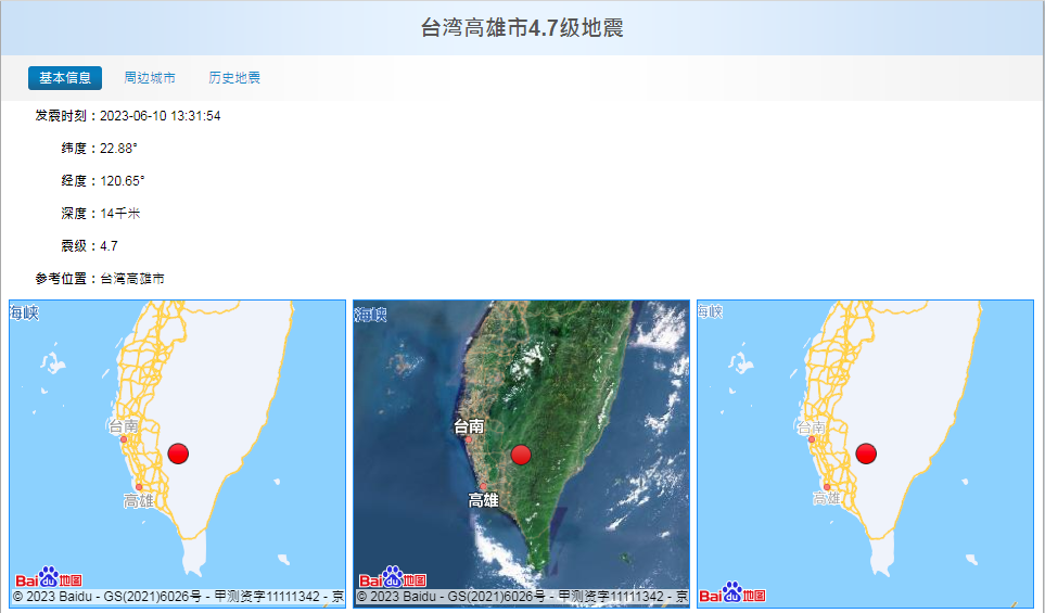 大公文匯全媒體報道,中國地震台網正式測定,6月10日13時31分在台灣高雄市(北緯22.88度,東經120.65度)發生4.7級地震,震源深度14千米。