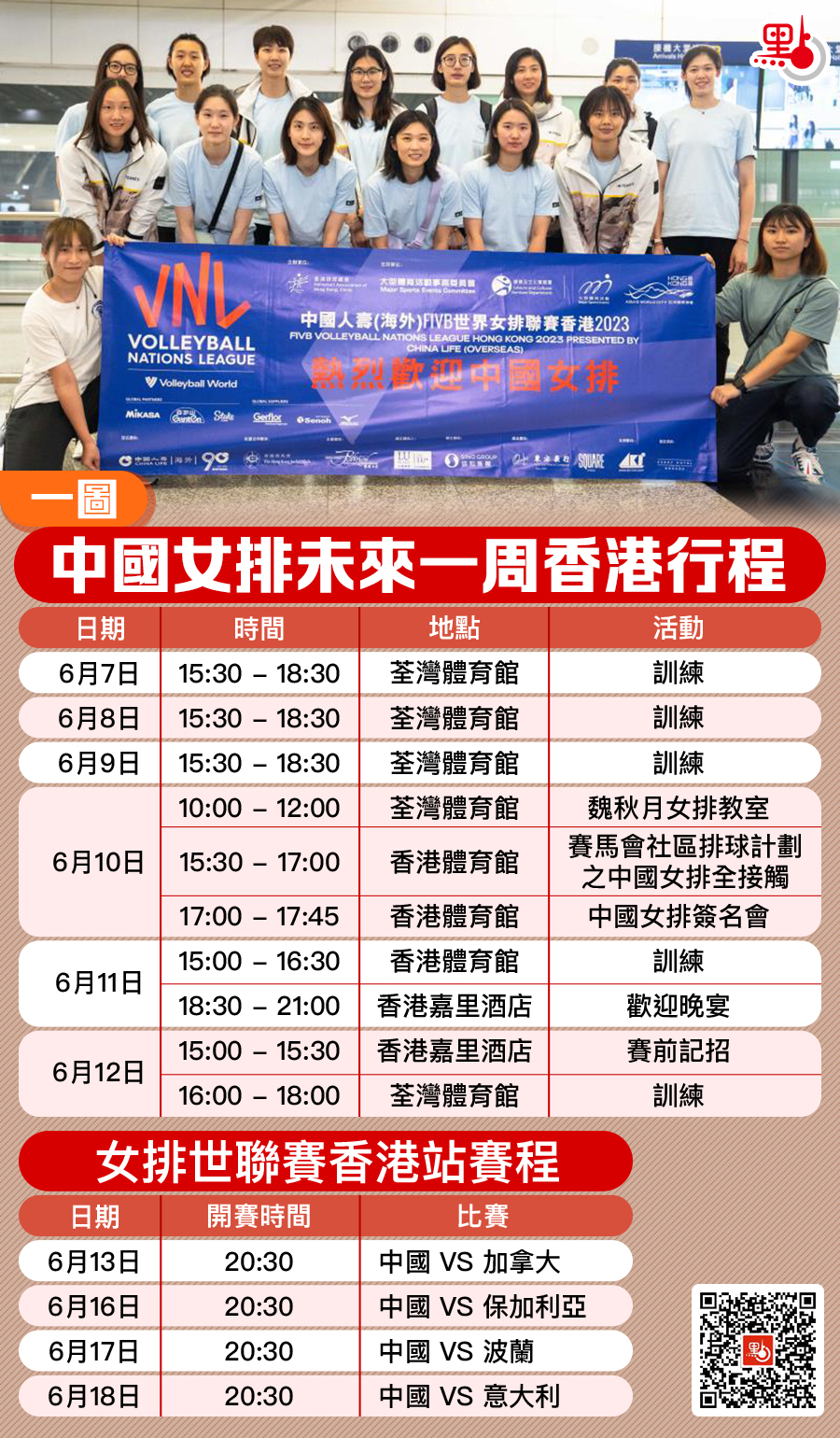 中國女排於本月6日晚抵港,在經歷名古屋的四連勝後,球隊於次日起在紅館展開閉門適應性訓練,13日起將先後對陣加拿大、保加利亞、波蘭和意大利隊。
