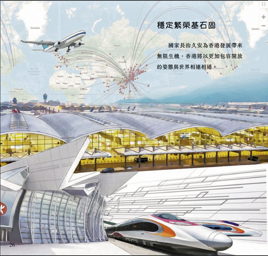 「穩定繁榮基石固」章節則提到,國家長治久安,為香港發展帶來無限生機,香港將以更加包容開放的姿態與世界相連相通。中央先後推出一系列重大政策,全力支持香港發揮「一國兩制」下背靠祖國、聯通世界的獨特優勢,主動對接國家「十四五」規劃,抓住粵港澳大灣區建設和「一帶一路」倡議的國家重點戰略,與世界各地展開更廣泛、更緊密的聯繫和交流合作,讓香港更好融入國家發展大局。
