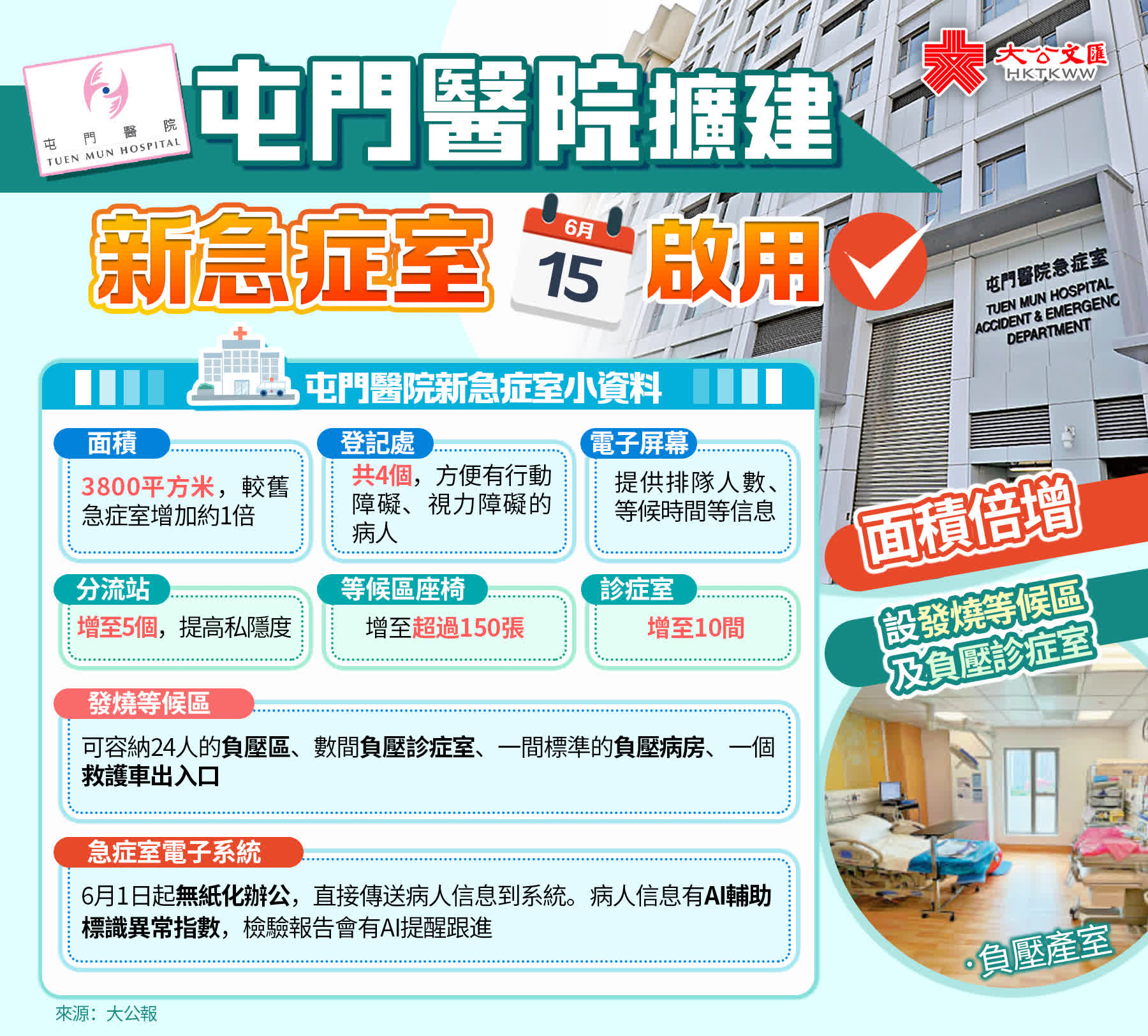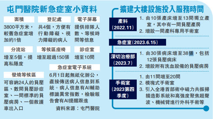 屯門醫院手術室在2016年開展擴建計劃,至去年完成工程,並分階段投入服務。新急症室面積較擴建前增加約一倍,達3800平方米。分流站、診症室和等候區座位的數量會相應增加,另增設負壓診症室與發燒等候區等設施(見表),處理有傳染風險的病人。從6月1日起,急症室推行無紙化,病人資料將不再倚賴手寫,改為直接輸入電腦並輔以AI提醒醫生病例信息加以處理,等候區亦有實時反映就診壓力的數據看板,便於醫護及時援助壓力點。