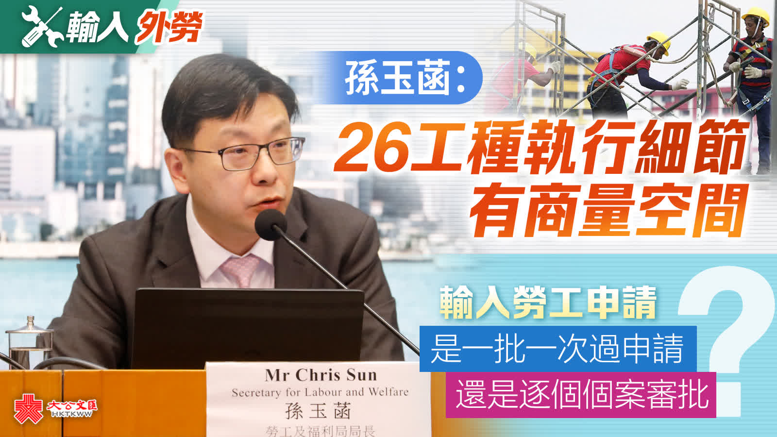 大公文匯全媒體報道,政府昨日公布輸入外勞安排,建造業及運輸業輸入2萬名外勞,外勞薪資不得低於本地同行業中位數。勞工及福利局局長孫玉菡今日(14日)在電台節目中表示,市場很多元化,不是每個行業都可準確統計薪資水平,一些涉及多工種的行業就比較複雜,政府要分別和勞資雙方了解及確認,強調薪資有單有據,不能作假。