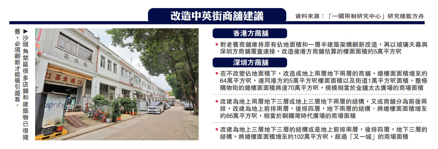 「香港中英街核心區可保持原有街道風貌,維持原本建築高度,按照相關程序活化改造並仍作商舖用途,符合政府規定,活化改造可行性強。」方舟建議,把港方中英街老舊街舖統一翻新改造,對深圳一方現有的兩層高店舖進行活化擴容,適度拓寬、提高使用面積,再用玻璃天幕把中英街兩邊的店舖覆蓋互連成一體,可以容納更多遊客。