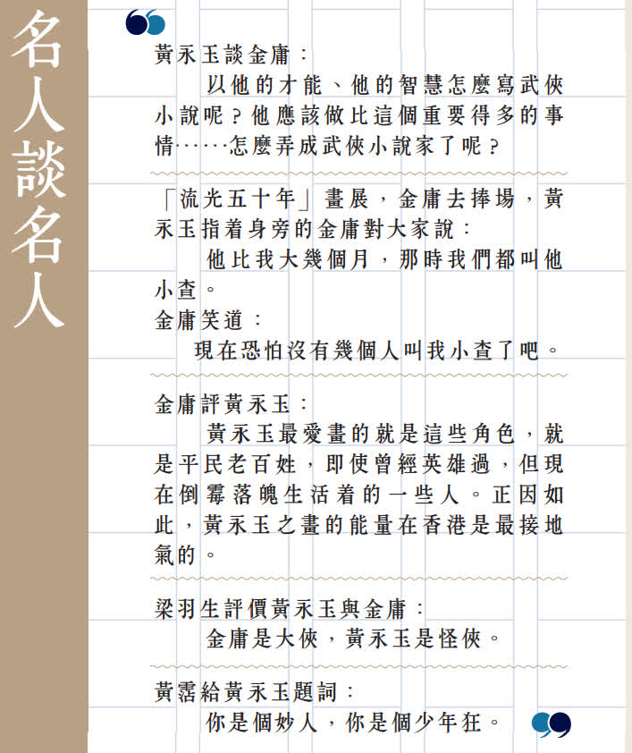對於因寫武俠小說而在華人文化中影響深遠的金庸,耿直幽默的黃永玉時常拿他打趣,「那時寫影評是我先寫的,寫武俠小說也是陳文統(梁羽生原名)先寫的。」不過黃永玉十分讚賞陳文統和查良鏞後來在創作和事業上取得的成就。