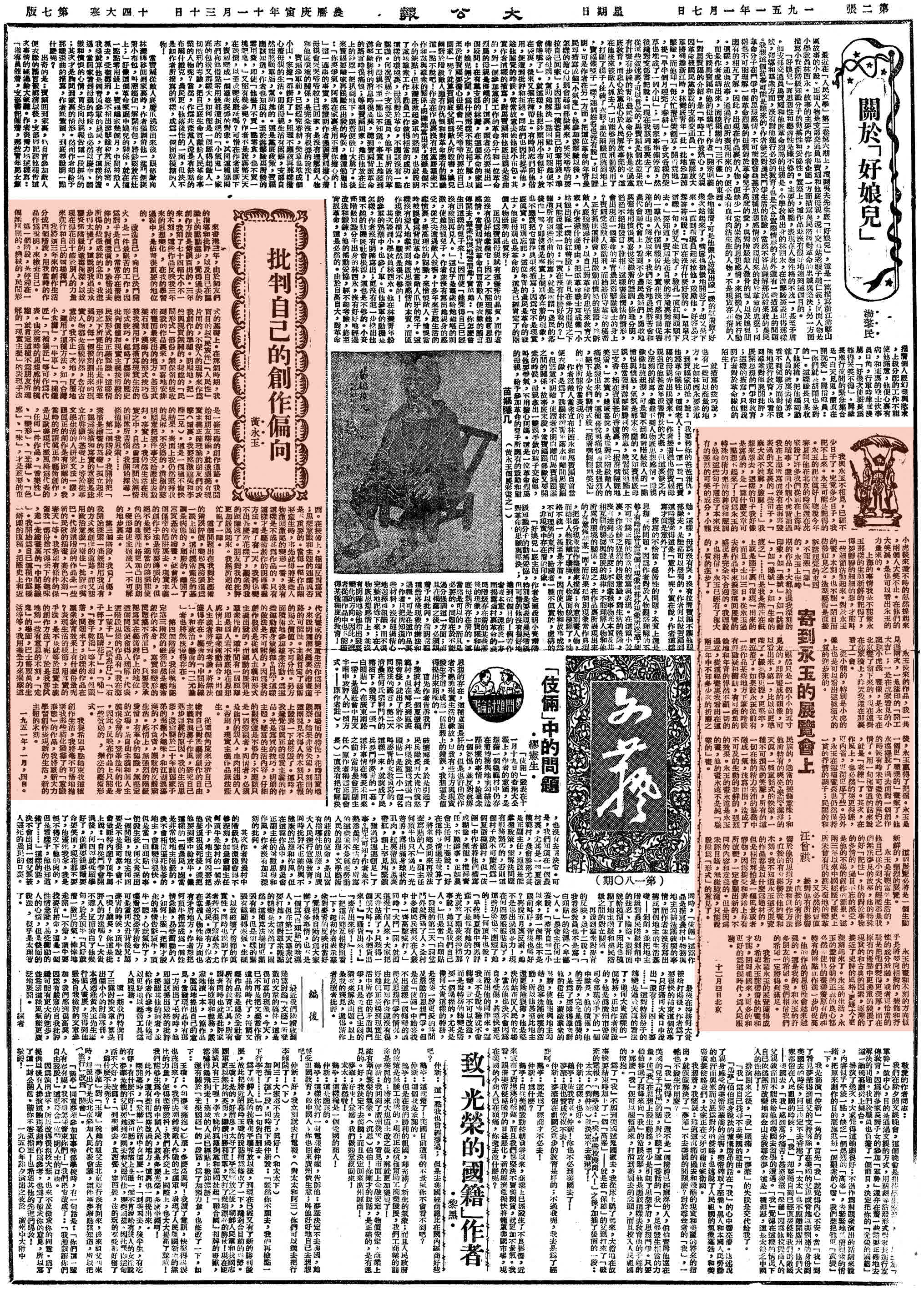 1948年,參加左翼運動的黃永玉,為了逃避迫害而離開上海遠赴香港。幾年後經人介紹,到《大公報》任職美術編輯,主要為新聞報道做插畫,偶爾也救場式地寫些文章。「有時周末編輯打電話,說你趕快來,一個字也沒有了。我就坐在咖啡屋裏開始寫罵國民黨的文章,整版4000多字,我這邊寫,排字房就在那等,寫一張排一張。」