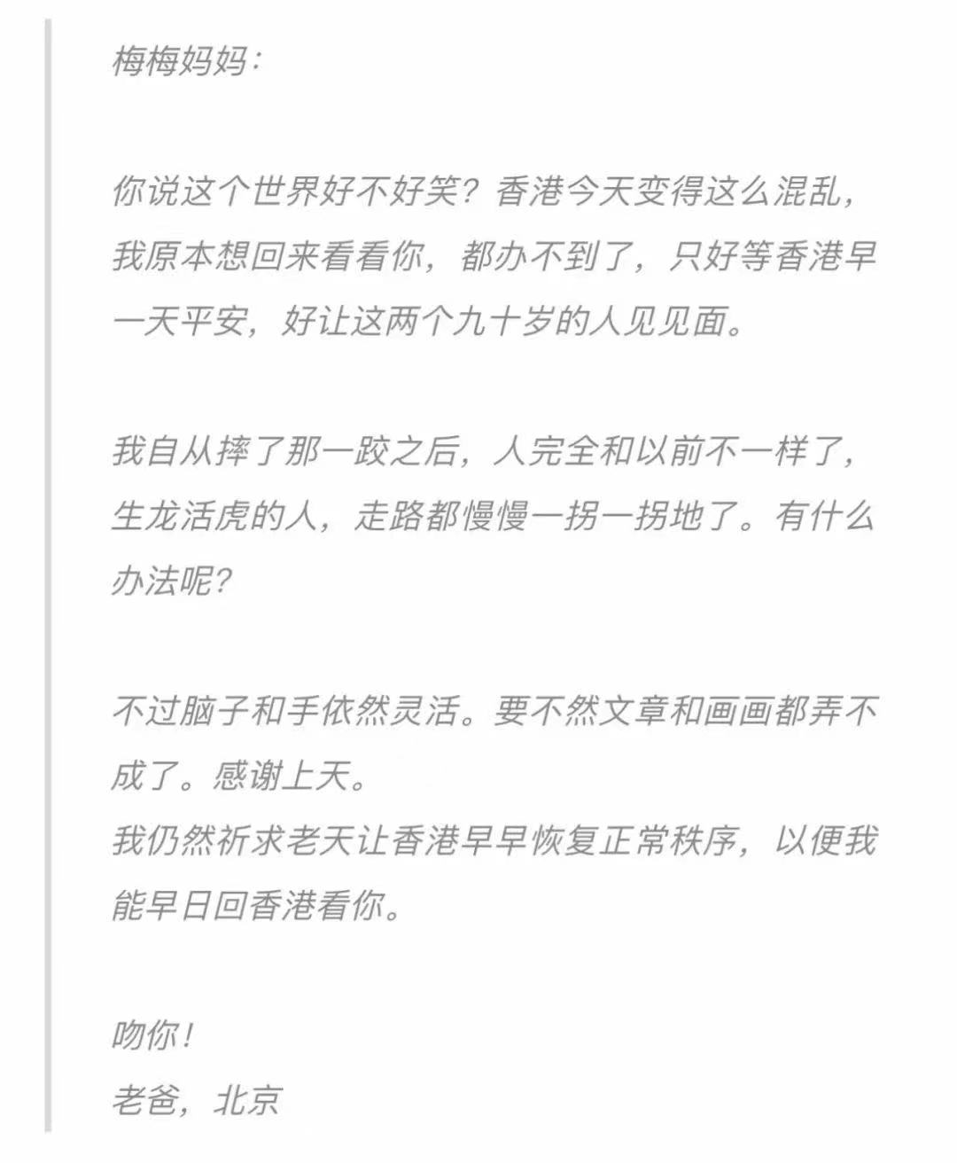 2019年,香港機場阻斷,黃永玉被困在了北京,他給梅溪的信中寫道:
