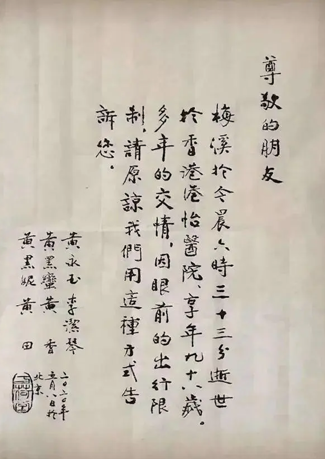然而,這次他再也沒有等到回信。2020年5月8日,他一生唯一的愛人張梅溪去世了。他親手寫下給愛人的最後一封情書——梅溪的訃告: