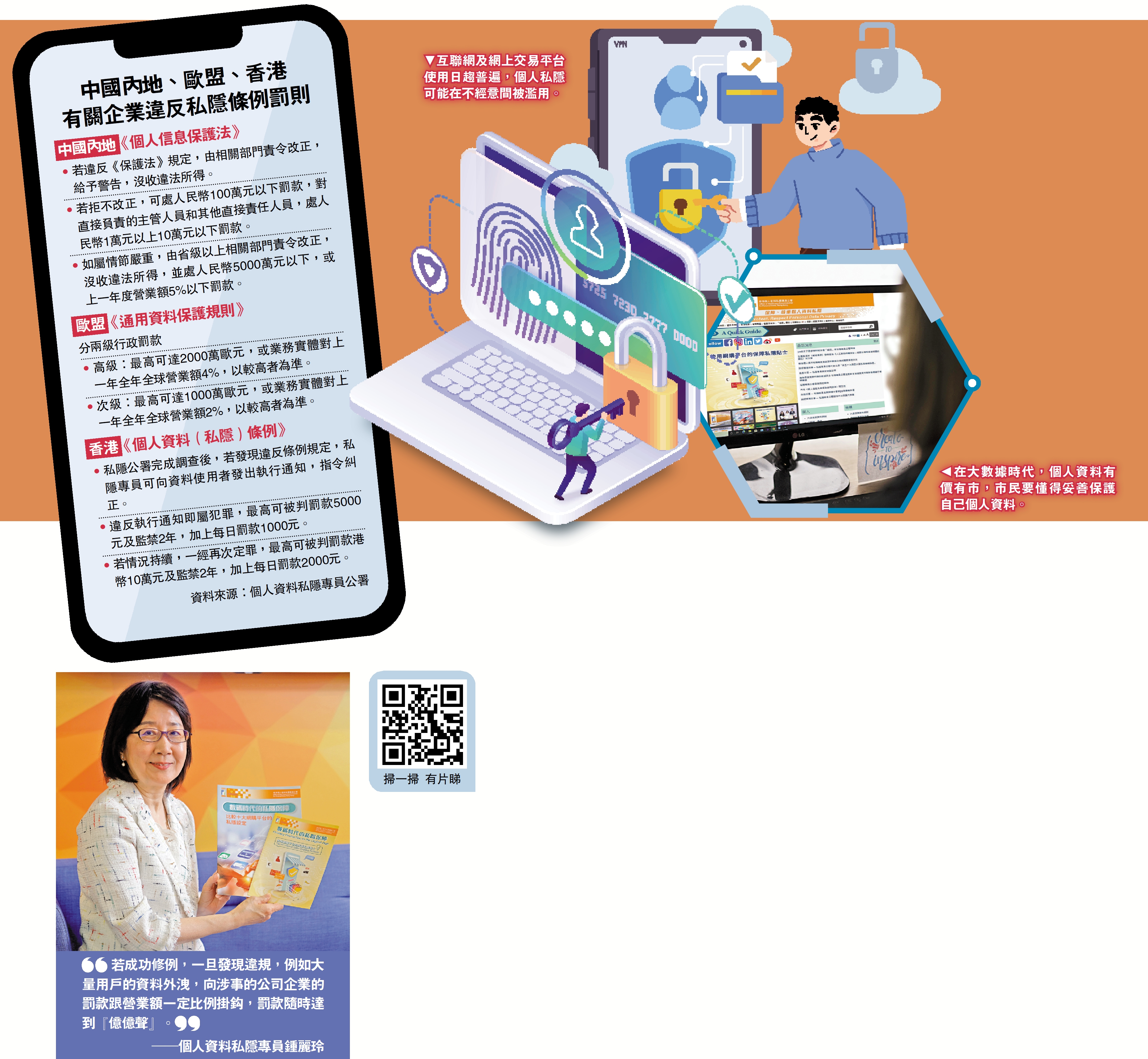 鍾麗玲表示,公署正聯同政府研究修訂《私隱條例》,加強對個人資料的保障,包括參考歐盟《通用資料保護規則》及其他司法管轄區的經驗的相關法例,考慮香港實際情況後,作出與時並進的修例建議,例如設立強制資料外洩通報機制,以及提升懲處權力和罰則。