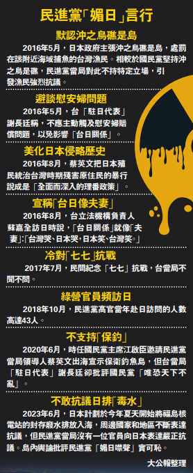 大公報綜合台媒報道,日本預計最快將於7月排放核廢水入海,有關舉措引發周邊國家及地區持續抗議,批評日本「極其不負責任」。值得注意的是,自詡「台日友好」的民進黨當局不僅沒有向日方表達抗議,還為日本排放核廢水辯護,聲稱「影響低微」,引得不少台灣黨派及民間團體公開喊話民進黨當局不要再「裝傻充愣」,為了民眾的生命健康應該向日本表達嚴正抗議。
