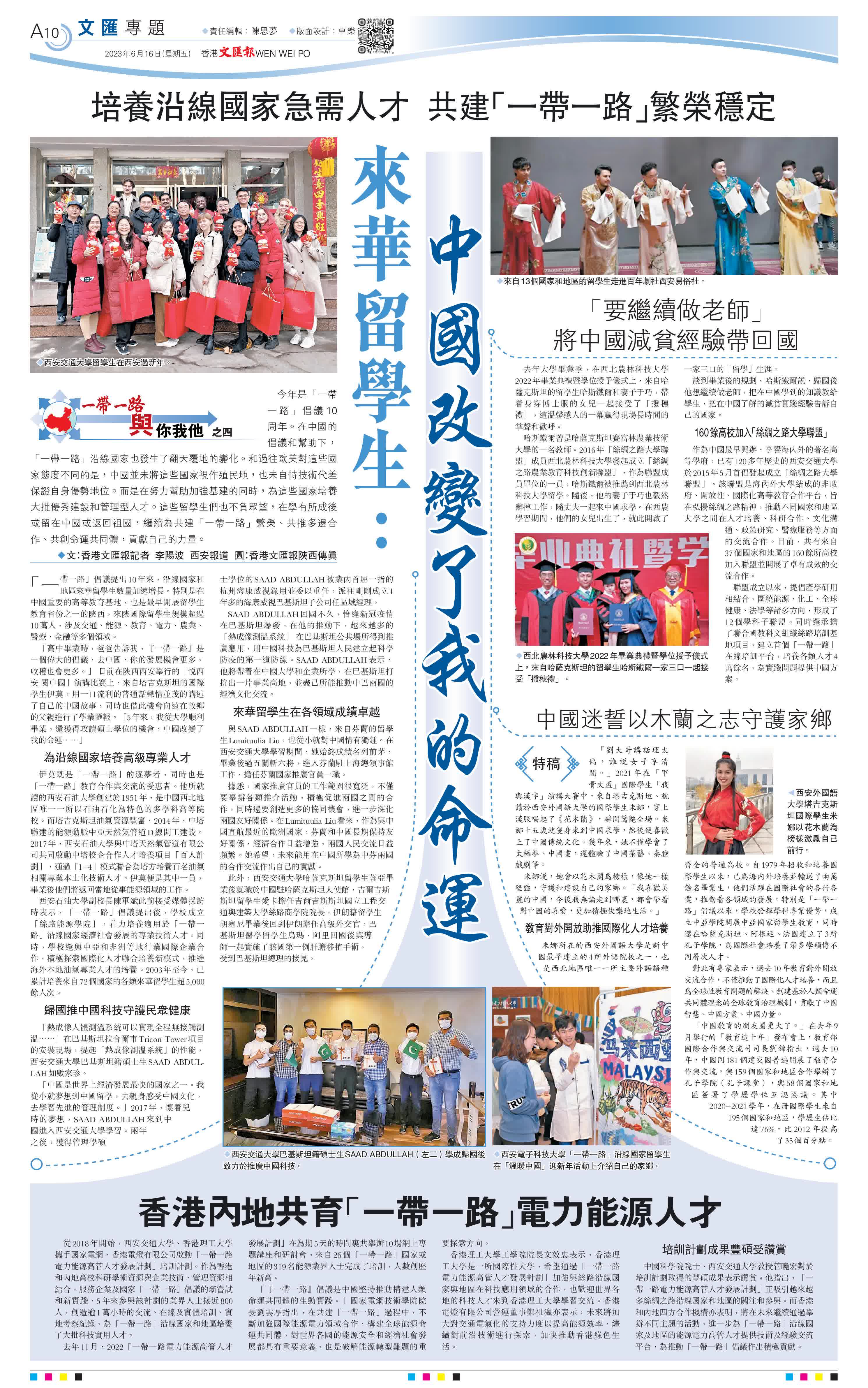 (香港文匯報 記者 李陽波)今年是「一帶一路」倡議10周年。在中國的倡議和幫助下,「一帶一路」沿線國家也發生了翻天覆地的變化。和過往歐美對這些國家態度不同的是,中國並未將這些國家視作殖民地,也未自恃技術代差保證自身優勢地位。而是在努力幫助加強基建的同時,為這些國家培養大批優秀建設和管理型人才。這些留學生們也不負眾望,在學有所成後或留在中國或返回祖國,繼續為共建「一帶一路」繁榮、共推多邊合作、共創命運共同體,貢獻自己的力量。
