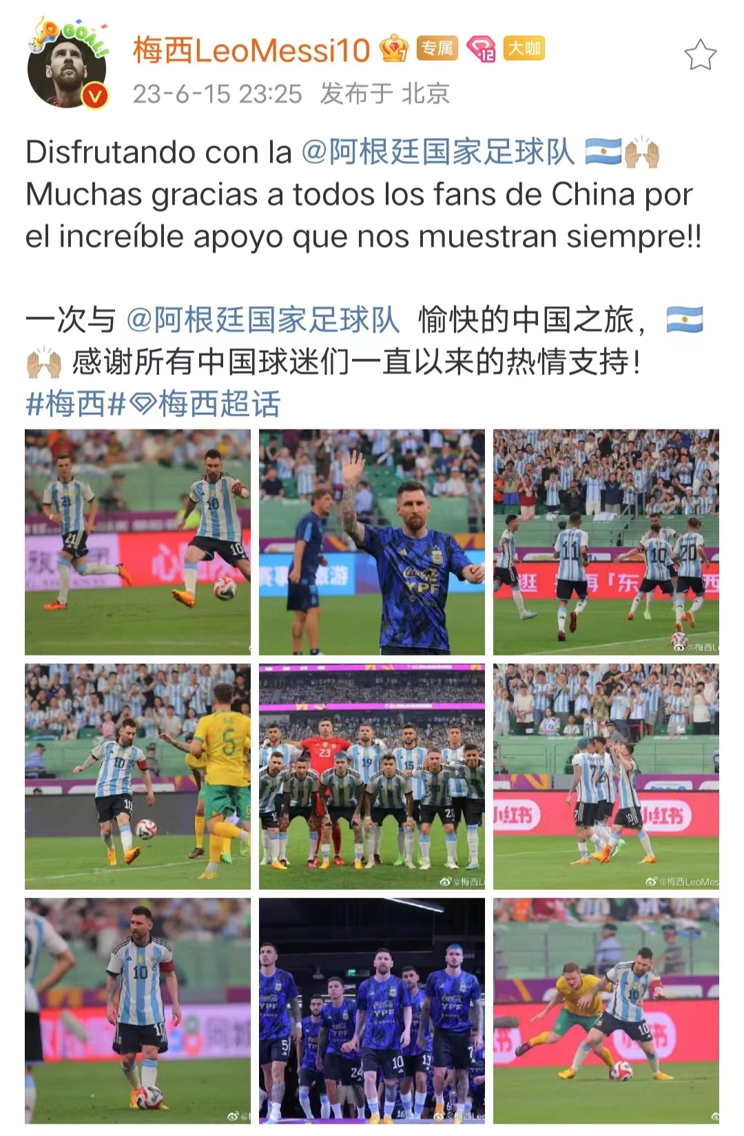 自6月10日美斯抵京以來,球迷的熱情逐漸高漲。15日晚,全國各地的美斯粉將工人體育場變為一片「藍白海洋」。賽後,美斯在個人社交媒體發文:「一次與 @阿根廷國家足球隊愉快的中國之旅,感謝所有中國球迷們一直以來的熱情支持!」