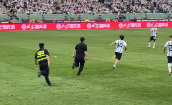 15日晚上,阿根廷「球王」美斯率領的世界盃冠軍阿根廷隊在北京工人體育場與澳洲隊進行友誼賽,阿根廷以2比0擊敗澳洲,比賽吸引了大批內地球迷入場觀看。不過在比賽過程中,這名姓邸的內地男球迷衝入球場擁抱了美斯,並和阿根廷隊門將馬天尼斯擊掌,隨後狂奔大半場,最終被安保人員帶離,引發網絡熱議。
