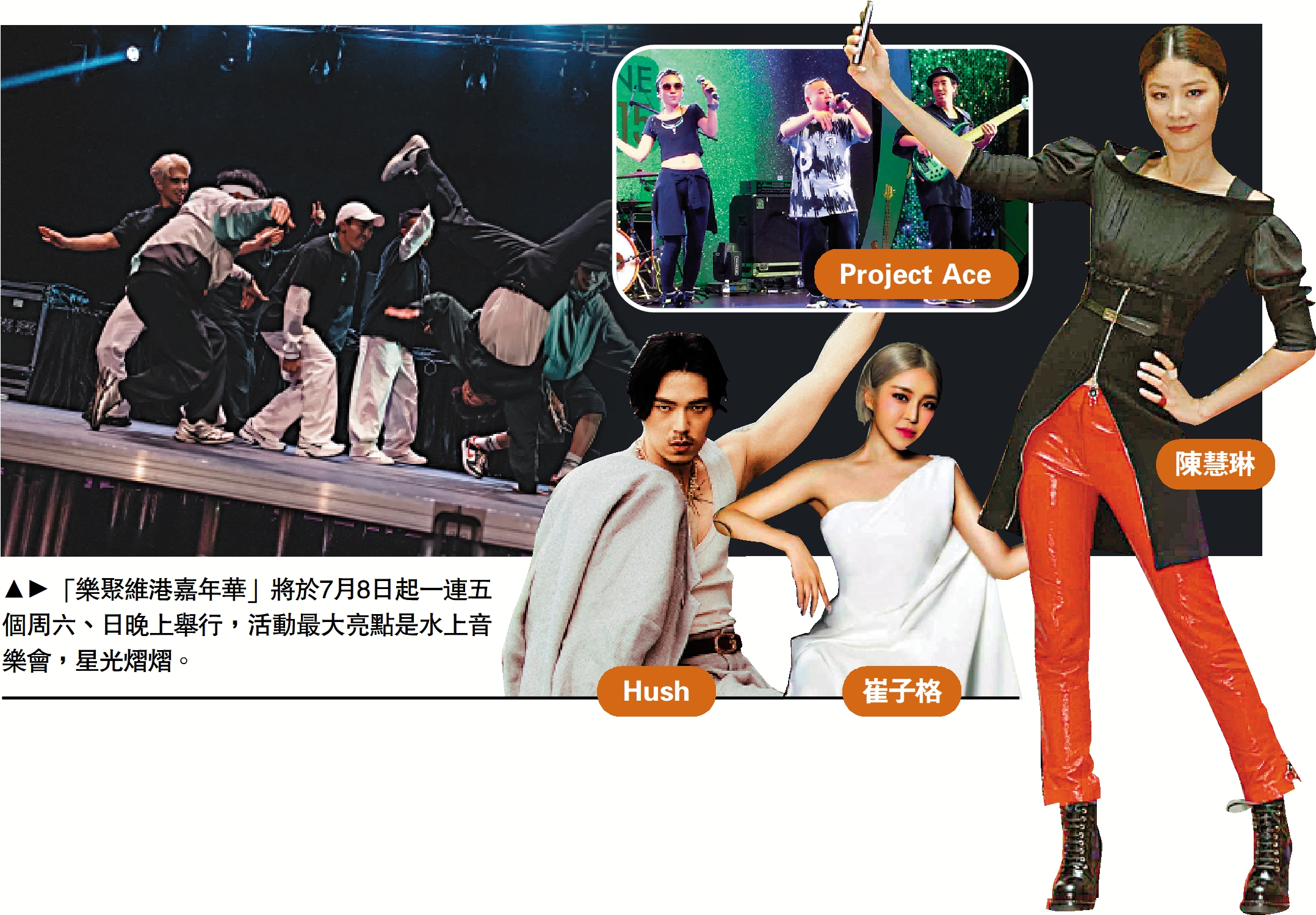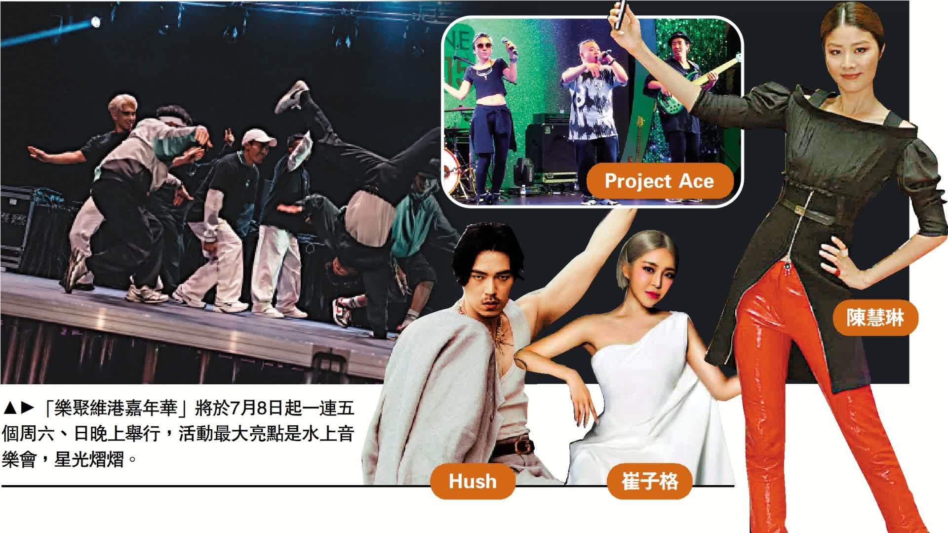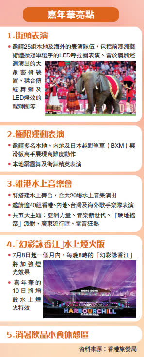 (大公報記者 王亞毛)夏日維港盛事浪接浪!繼一對大黃鴨在維港「暢泳」之後,旅遊發展局延續「開心香港」效應,7月8日起一連五個周末晚上,在灣仔海濱舉行「樂聚維港嘉年華」,維港將會搭建舞台,上演20場水上音樂會,料再掀熱浪,香港的陳慧琳、陳柏宇等歌星以及海內外歌手將獻藝,並有滑板、越野單車、霹靂舞等X-Game極限運動表演。