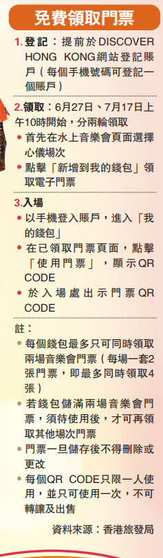 音樂會門票不設劃位,也不設座位,市民可提前於旅發局網站登記賬戶,並在6月27日及7月17日分兩輪免費領取門票,每個賬戶同時只可領取最多兩場門票。旅發局總幹事程鼎一昨日表示,每場音樂會將可容納2500名觀眾,當中八成為本港市民,剩餘兩成門票會預留給來港旅客。網上領取門票的做法與一般活動相若,每個QRcode只限一人使用,程鼎一說不擔心有人在網上轉售或炒賣。