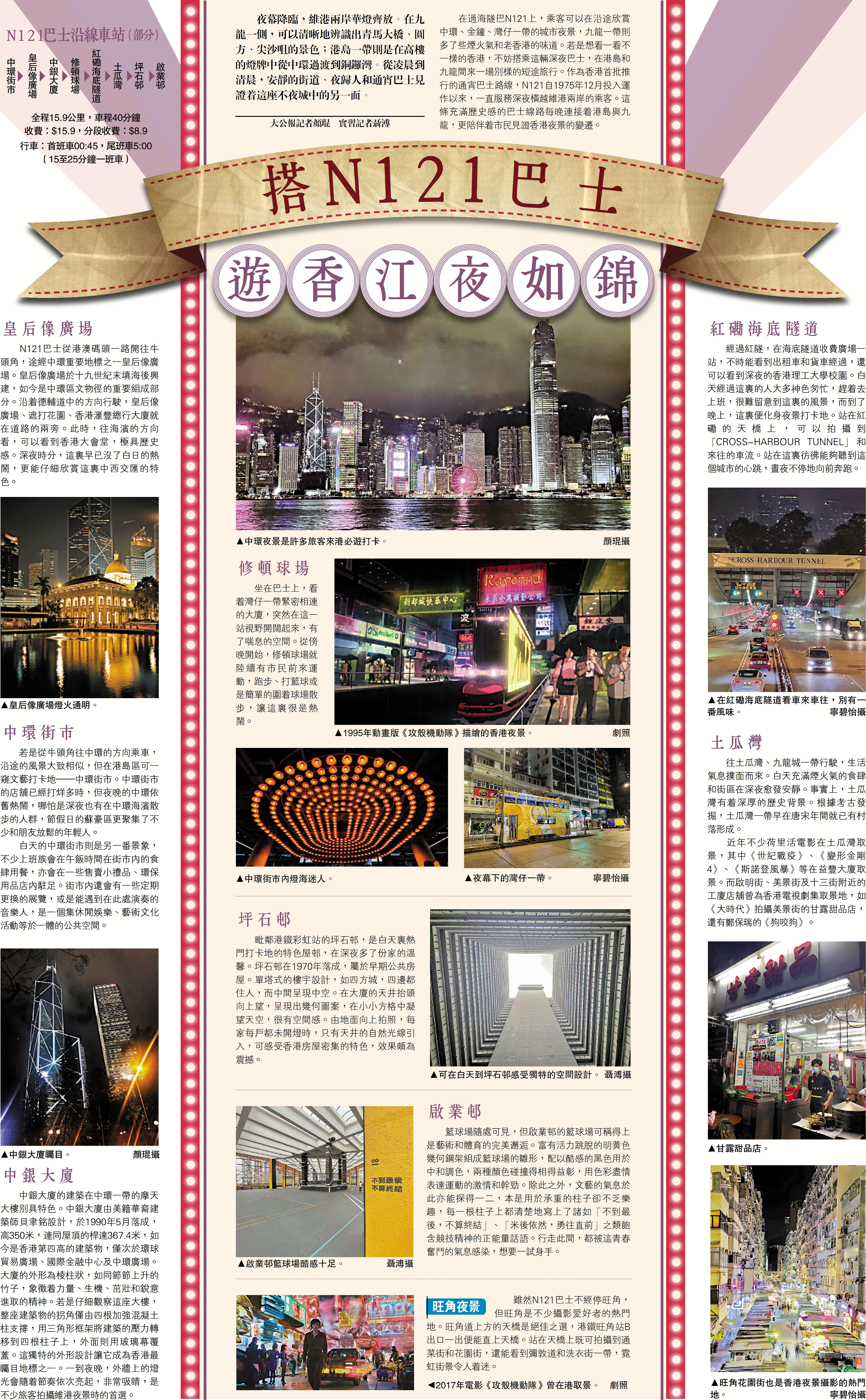 在過海隧巴N121上,乘客可以在沿途欣賞中環、金鐘、灣仔一帶的城市夜景,九龍一帶則多了些煙火氣和老香港的味道。若是想看一看不一樣的香港,不妨搭乘這輛深夜巴士,在港島和九龍間來一場別樣的短途旅行。作為香港首批推行的通宵巴士路線,N121自1975年12月投入運作以來,一直服務深夜橫越維港兩岸的乘客。這條充滿歷史感的巴士線路每晚連接着港島與九龍,更陪伴着市民見證香港夜景的變遷。