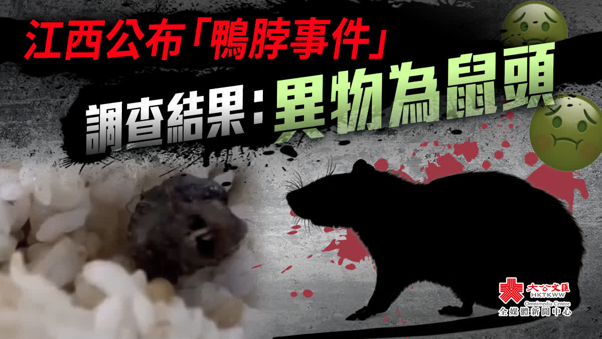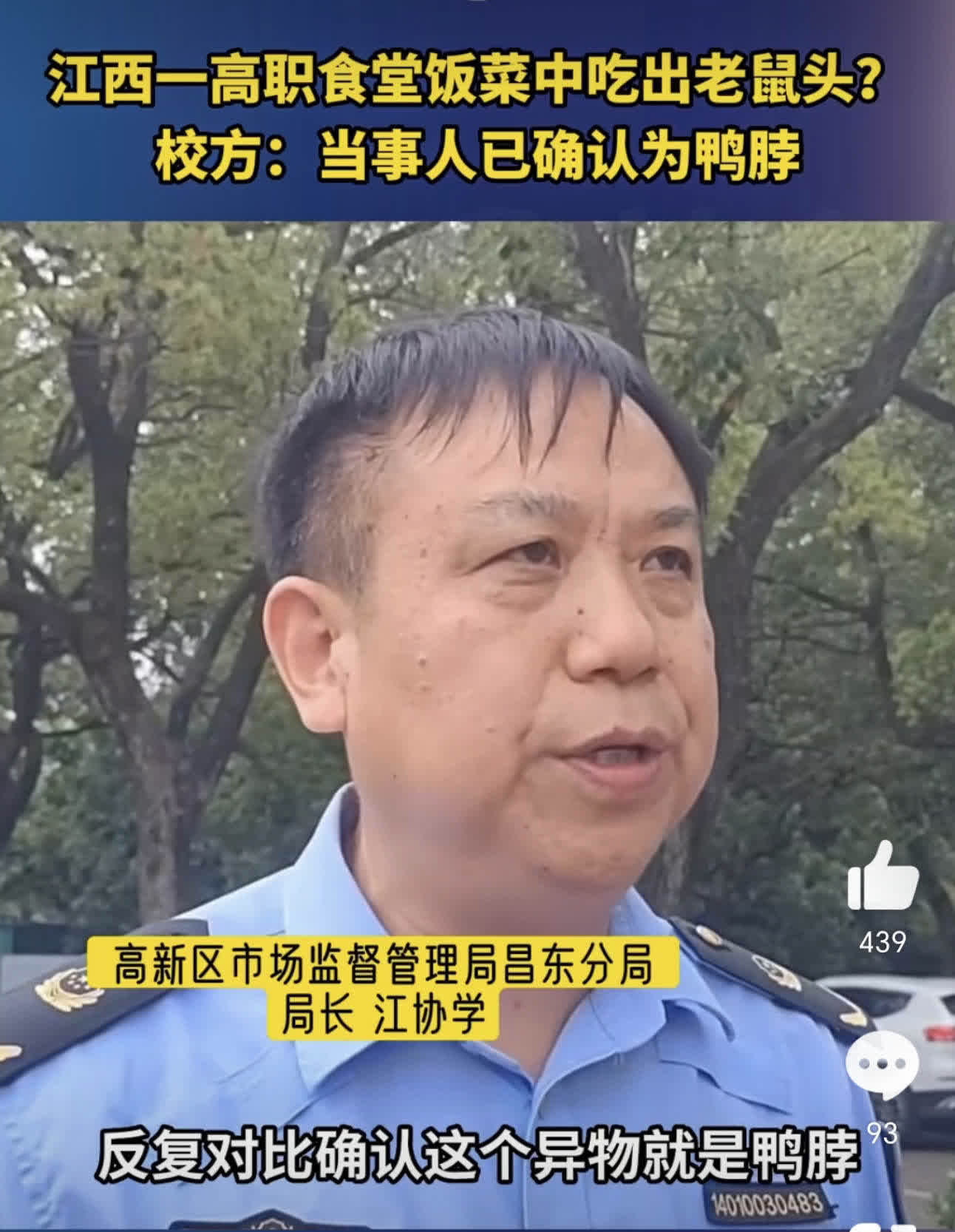 聯合調查組經勘查現場,調取監控視頻發現,6月1日,學生在食堂吃出疑似為「鼠頭」的異物,被涉事食堂工作人員事發當日丟棄。通過查看食堂後廚視頻,查閱採購清單,詢問涉事食堂負責人、後廚相關當事人、當事學生和現場圍觀學生等,判定異物不是鴨脖。根據國內權威動物專家對提取的當事學生所拍現場照片和視頻進行專業辨識,判定異物為老鼠類嚙齒動物的頭部。南昌高新區市場監督管理局昌東分局、江西工業職業技術學院未認真調查取證,發布「異物為鴨脖」結論是錯誤的。