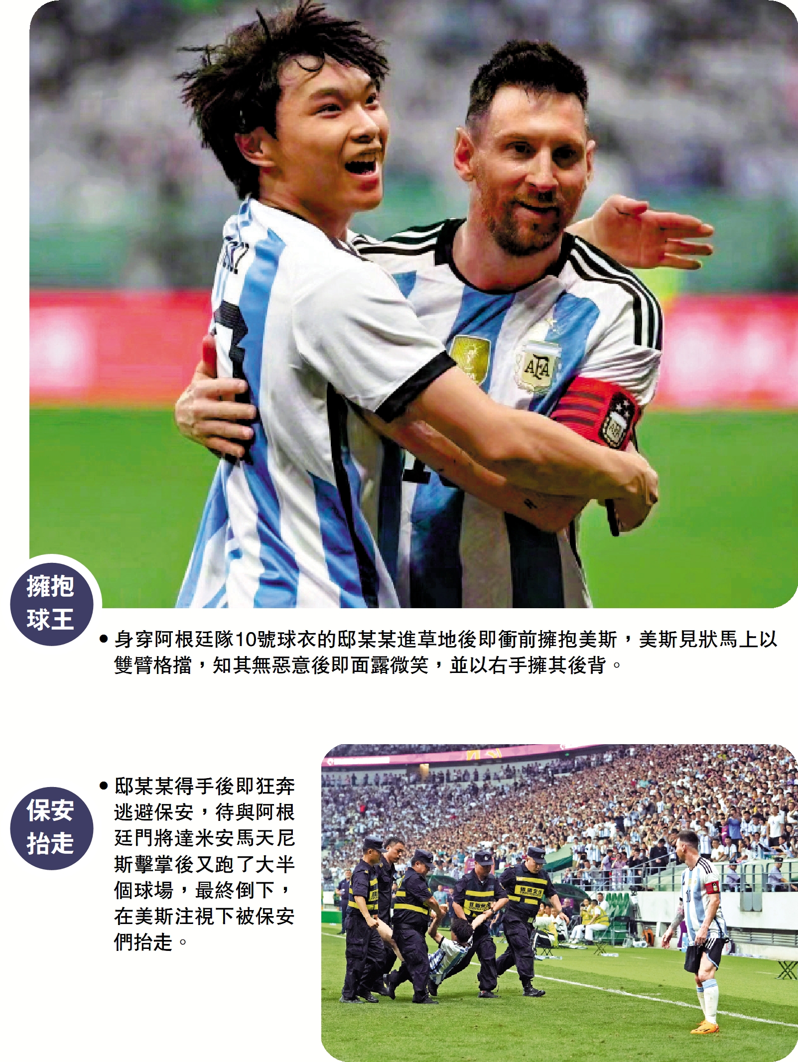 (大公報記者 張寶峰)邸某某得手後即狂奔逃避保安,待與阿根廷門將達米安馬天尼斯擊掌後又跑了大半個球場,最終倒下,在美斯注視下被保安們抬走。