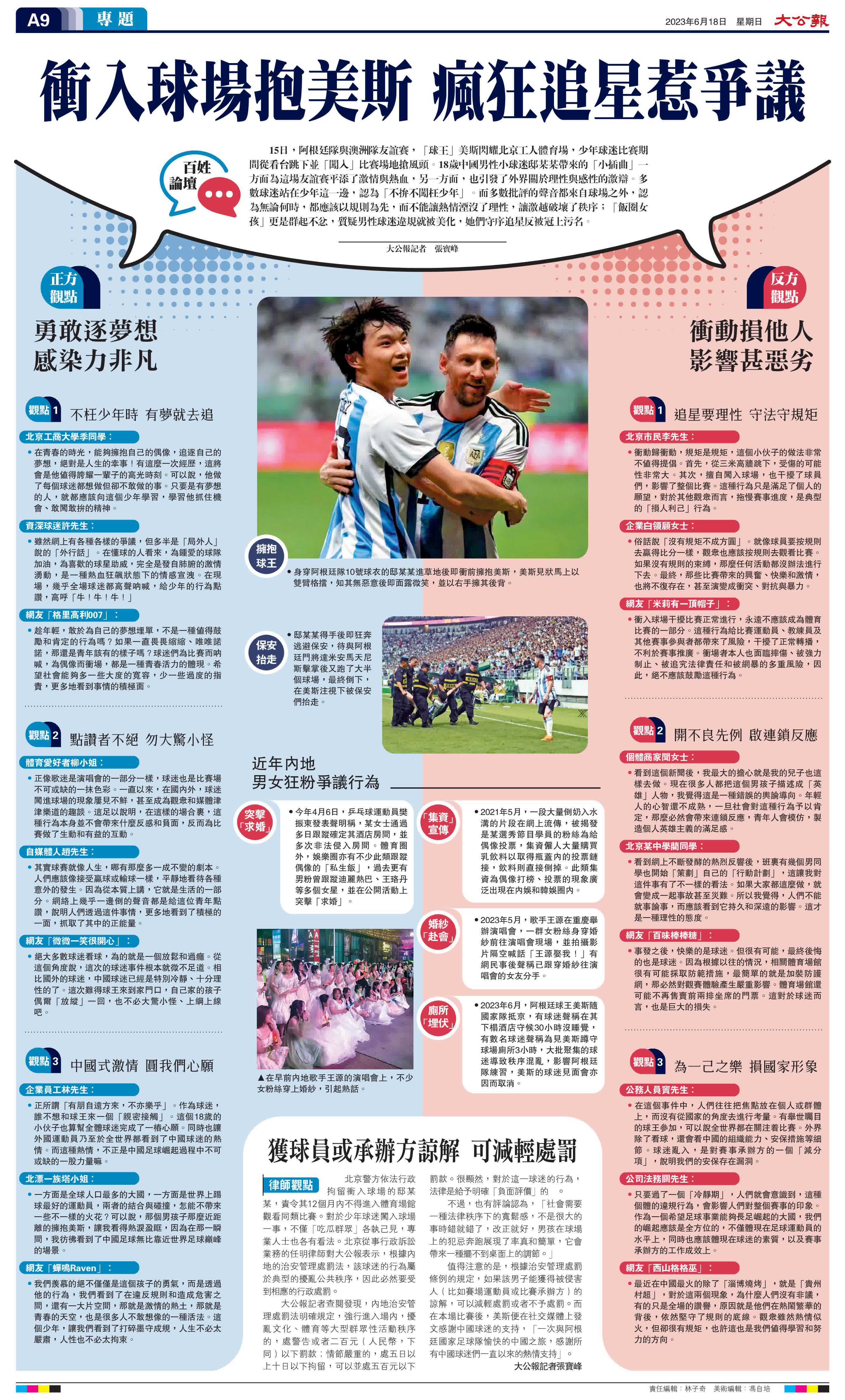 15日,阿根廷隊與澳洲隊友誼賽,「球王」美斯閃耀北京工人體育場,少年球迷比賽期間從看台跳下並「闖入」比賽場地搶風頭。18歲中國男性小球迷邸某某帶來的「小插曲」一方面為這場友誼賽平添了激情與熱血,另一方面,也引發了外界關於理性與感性的激辯。多數球迷站在少年這一邊,認為「不拚不闖枉少年」。而多數批評的聲音都來自球場之外,認為無論何時,都應該以規則為先,而不能讓熱情湮沒了理性,讓激越破壞了秩序;「飯圈女孩」更是群起不忿,質疑男性球迷違規就被美化,她們守序追星反被冠上污名。