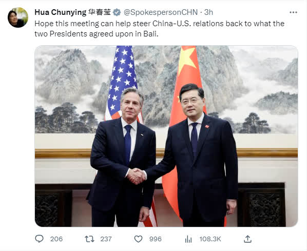 華春瑩發文稱,「期望此次會面能推動中美關係重回兩國元首去年在巴厘島會晤時達成的共識。」