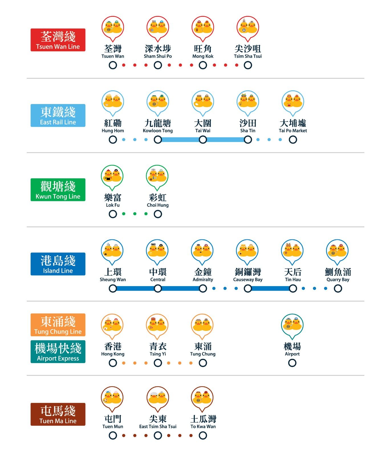 橡皮鴨港鐵藝術旅程由金鐘站啟航,隨着港鐵網絡「遊走」至不同社區,合共覆蓋24個港鐵車站。金鐘站內布滿橡皮鴨主題裝飾,車站每個角落如月台、樓梯、扶手電梯、牆壁等位置都滿布小鴨蹤影。此外,位於E出口的6米高乘24.5米闊半圓玻璃天窗更化身為鴨子臉,成為港鐵最大規模的戶外公共藝術裝置。市民如想一次過開心打卡各款鴨仔,前往金鐘站各處尋找,絕對是最佳選擇。