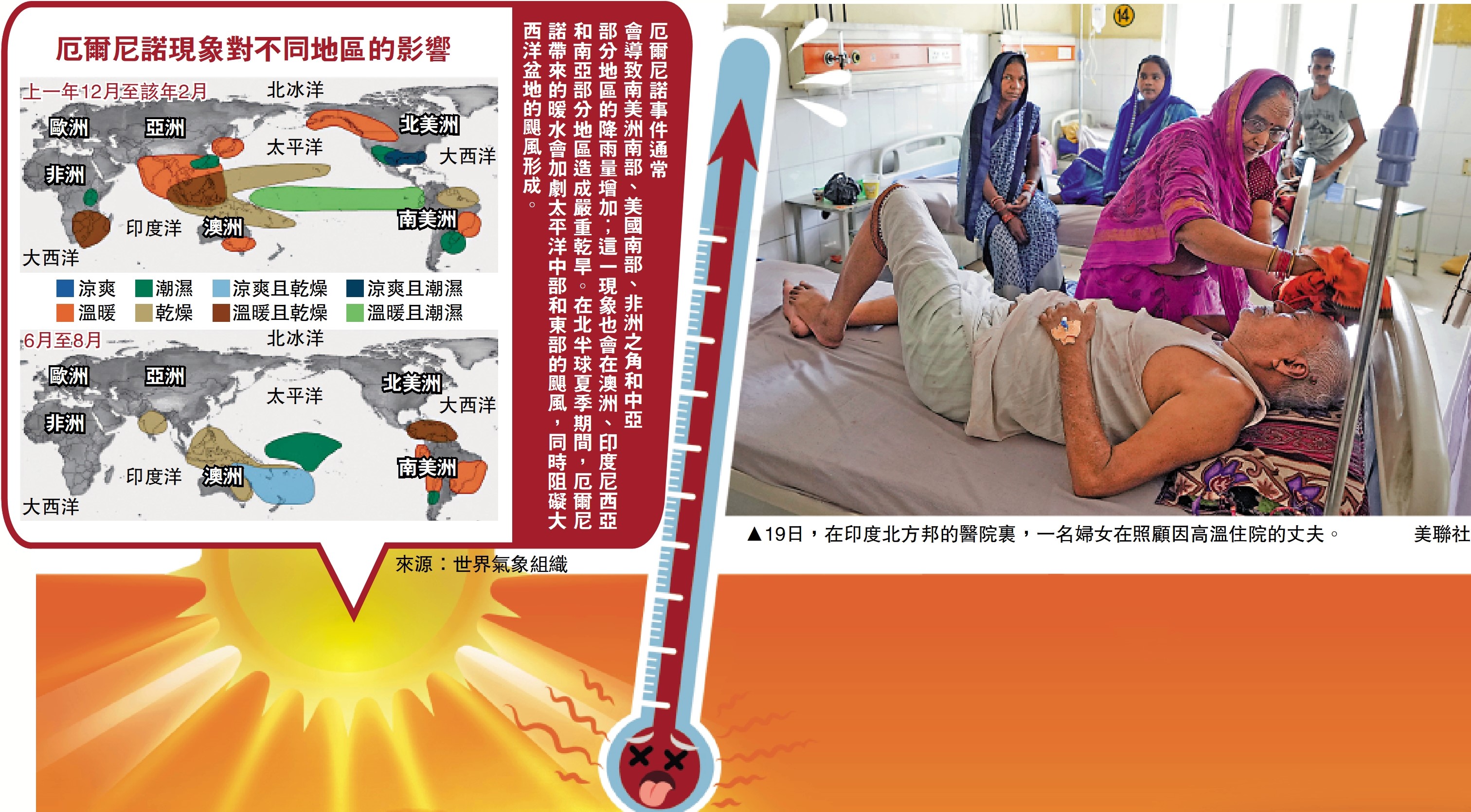 大公報綜合美聯社、《衛報》報道,厄爾尼諾現象今年捲土重來,北半球的夏天備受「烤」驗。印度近日受到熱浪衝擊,高溫飆破44℃。當地官員18日表示,人口最多的北方邦和比哈爾邦3天內有將近100人因高溫死亡,另外還有數百人出現嘔吐及腹瀉的中暑症狀被送往醫院接受治療。因死者多為年長者,印度氣象部門警告,呼籲60歲以上以及患有慢性疾患的民眾應避免在白天外出。另外,高溫同樣對印度的糧食生產和工業製造帶來了限制。