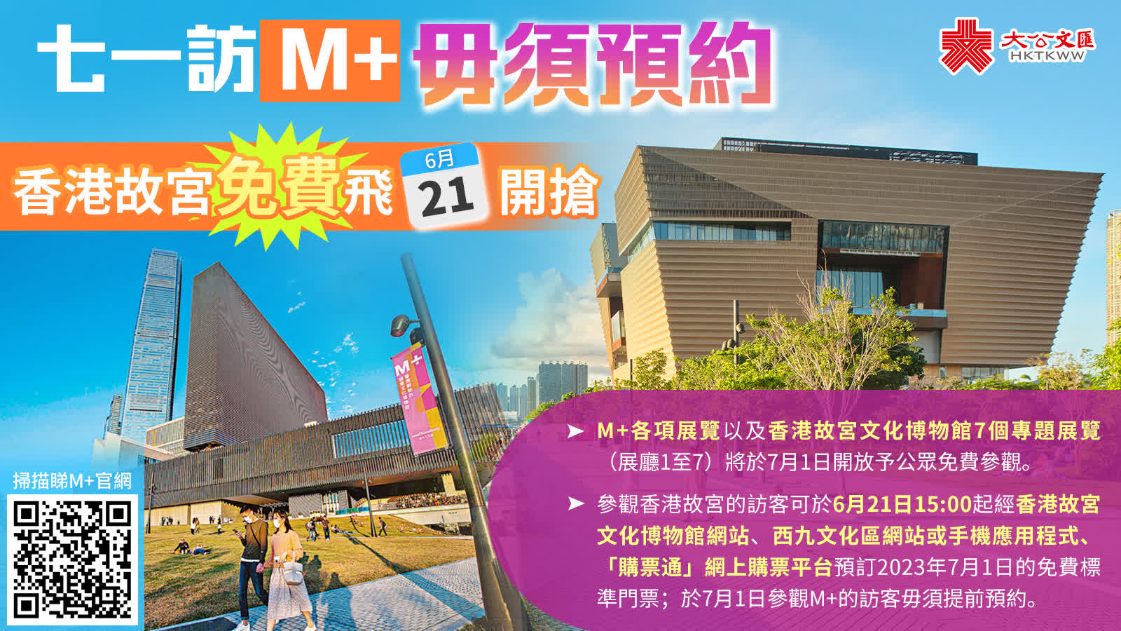 西九管理局提醒,參觀香港故宮的訪客可於明日(21日)下午3時起經香港故宮文化博物館網站、西九文化區網站或手機應用程式、「購票通」網上購票平台預訂2023年7月1日的免費標準門票;於7月1日參觀M+的訪客毋須提前預約。