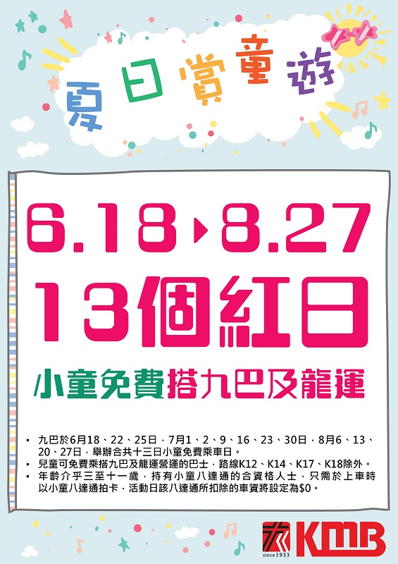 為讓兒童享受疫後首個暑假和帶動社會活動復常,九巴舉辦「夏日賞童遊」小童免費乘車日,涵蓋端午節至暑假所有公眾假期和星期日,適用於小童年齡介乎3至11歲,合資格使用小童八達通的人士,只需於上車時以小童八達通拍卡,活動日該八達通所扣除的車資將設定為$0。